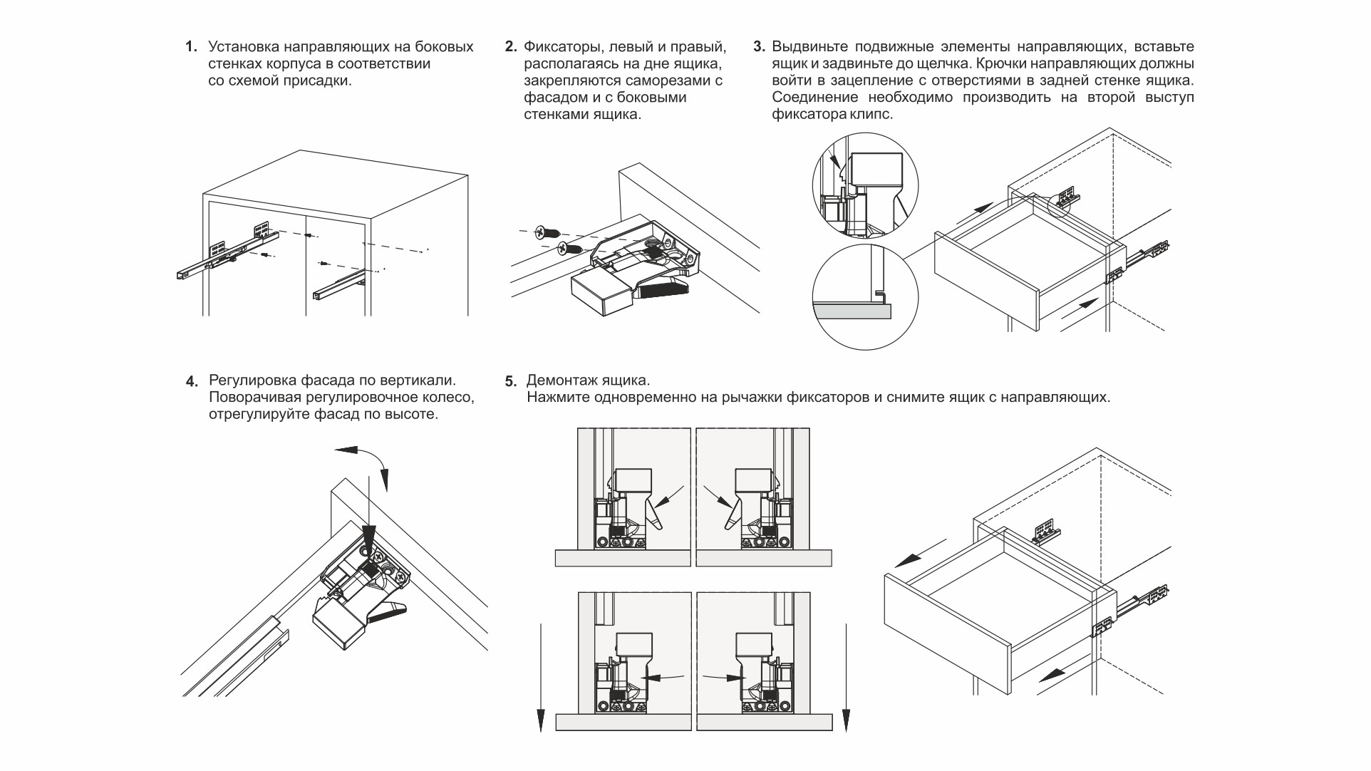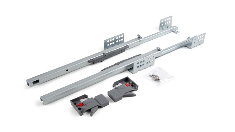 В направляющих предусмотрены дополнительные металлические упоры на подвижной и неподвижной частях направляющих для сдерживания давления в момент установки и в процессе эксплуатации. Это снижает риски излома механизма ПУШ, а также избавляет от необходимости создания дополнительных упоров при создании выдвижных ящиков с вкладным типом фасадов.