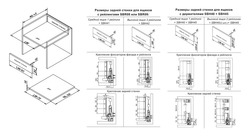 Для сборки выдвижного мебельного ящика с помощью направляющих DB8181 необходимо самостоятельно изготовить фасад, заднюю стенку и дно ящика, изготовленные с учетом собственных пожеланий и потребностей, а также выбрать боковины, держатели задней стенки и держатели рейлинга и сами рейлинги (в зависимости от требуемой высоты проёма готового выдвижного мебельного ящика). Схема раскроя дна выдвижного мебельного ящика соответствует уже зарекомендовавшей себя популярной системе B-BOX SB04 и европейским аналогам.