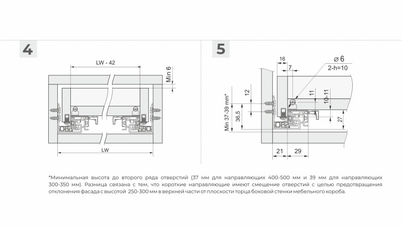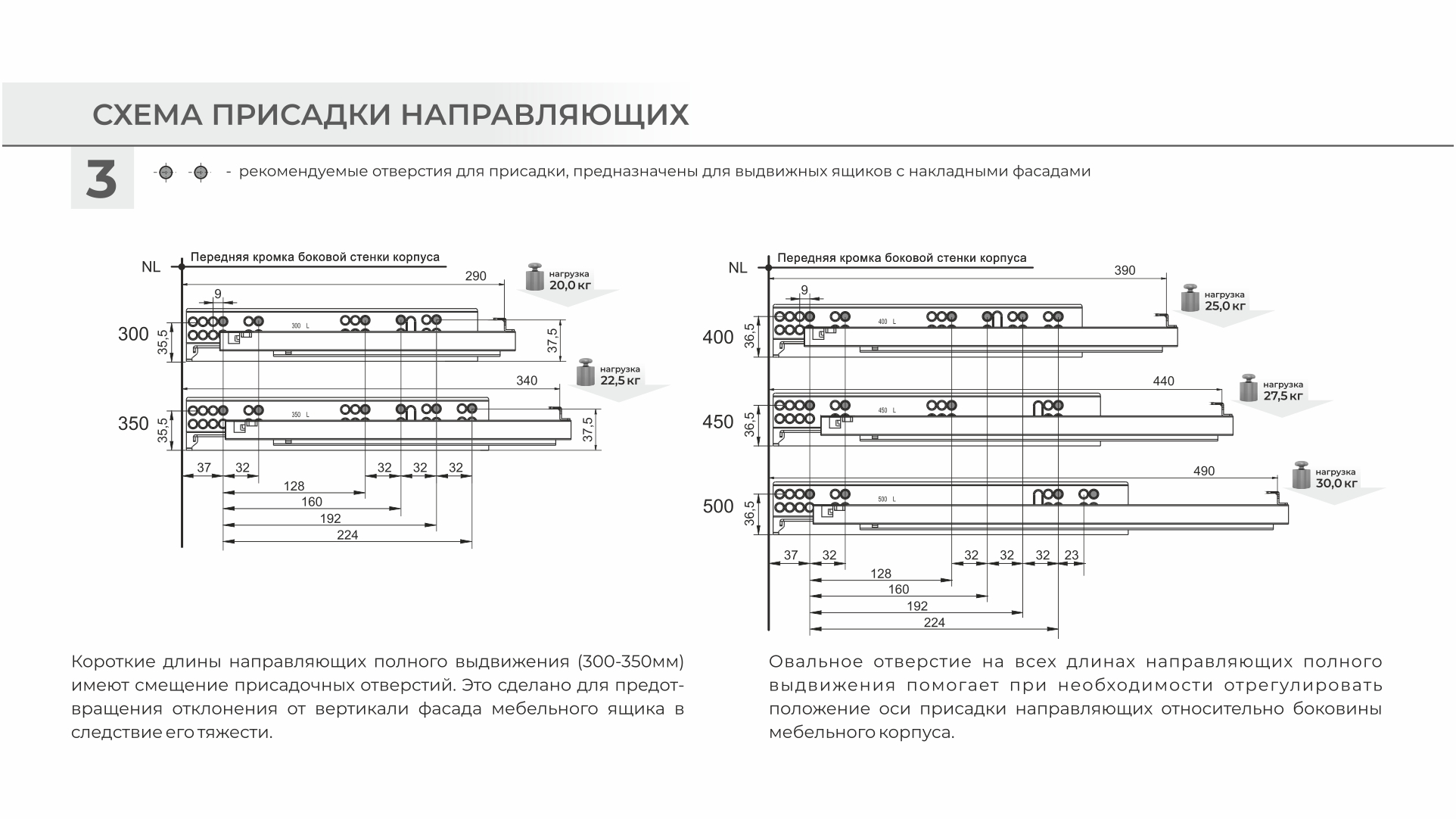 В коротких длинах направляющих DB8783 (250-350 мм) предусмотрено смещение оси присадочных отверстий. Это обеспечивает точное и плотное прилегание фасадов к боковинам мебельного корпуса, даже если неглубокий выдвижной ящик устанавливается с габаритными, высокими фасадами.