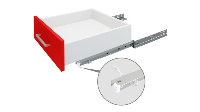B-Slide DB8783 — базовые направляющие скрытого монтажа полного выдвижения с плавным доведением и выверенным набором опций и возможностей для мебельных производителей. Это направляющие насадного монтажа с цапфой, которая обеспечивает регулировку положения фасада по вертикали до 6 мм.