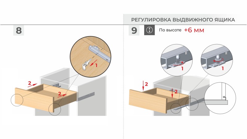 В коротких длинах направляющих DB8783 (250-350 мм) предусмотрено смещение оси присадочных отверстий. Это обеспечивает точное и плотное прилегание фасадов к боковинам мебельного корпуса, даже если неглубокий выдвижной ящик устанавливается с габаритными, высокими фасадами.