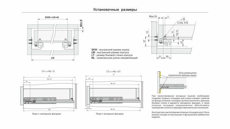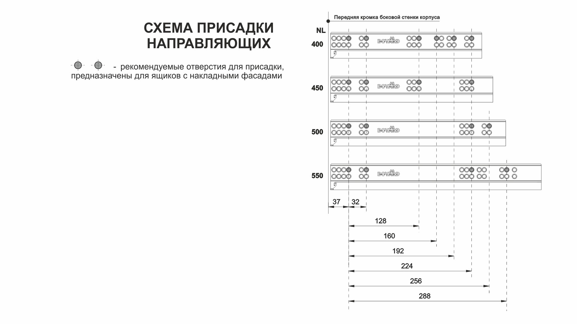 Разница в монтаже коротких и больших длин заключается в значении min отступа от дна мебельного корпуса до верхнего ряда присадочных отверстий направляющей. У неглубоких моделей, до 350 мм включительно, это значение составляет min 39 мм. Установка по схеме позволяет достичь зазора в 2 мм между мебельным корпусом и направляющей. Именно корректный монтаж, в соответствие со схемой, позволяет избежать отклонения фасада с высотой 250-300 мм в верхней части от плоскости торца боковой стенки мебельного изделия.
