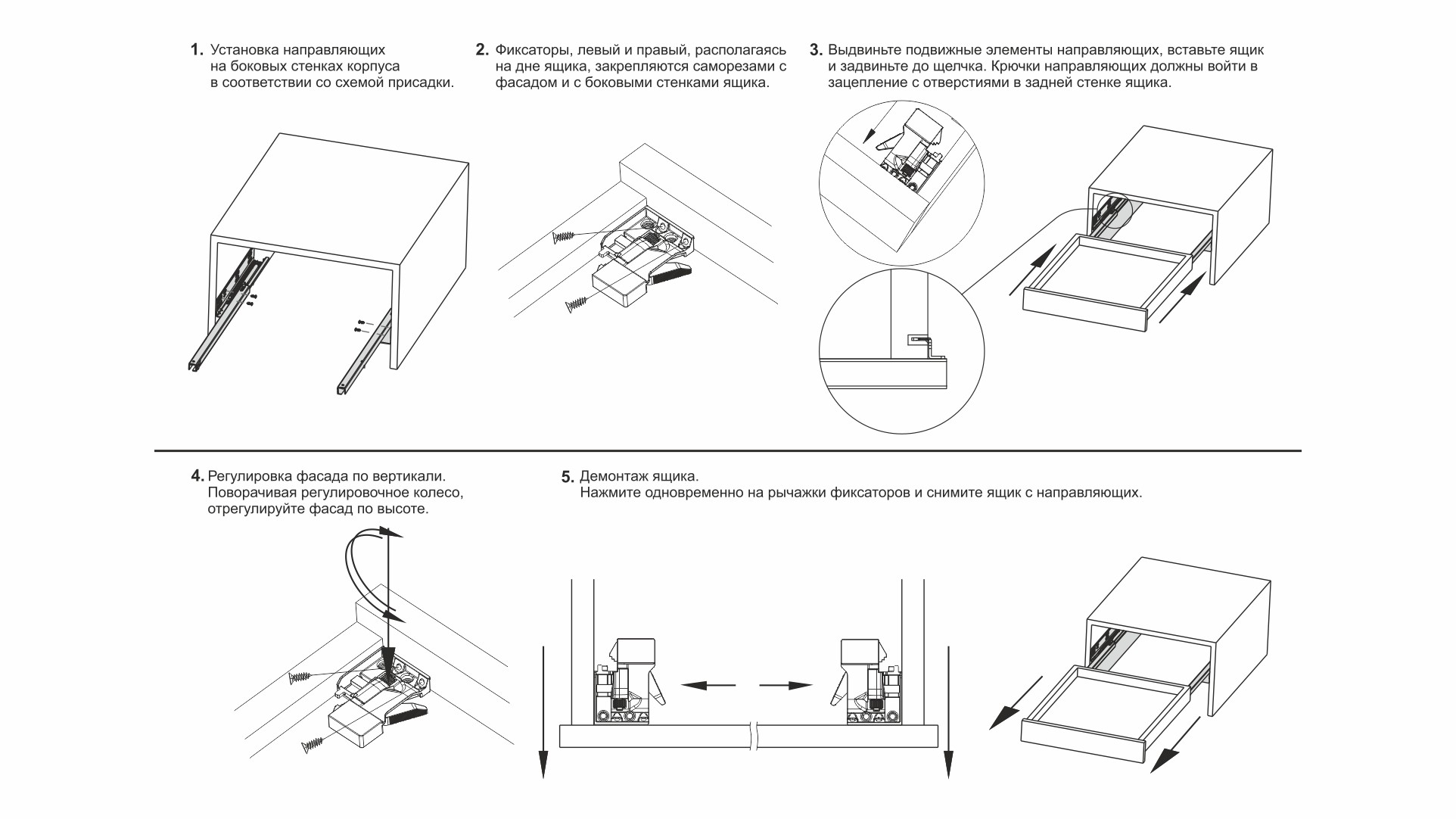 Направляющие скрытого монтажа полного выдвижения с опцией открывания лёгким нажатием на фасад (push-to-open), со способом установки мебельного ящика при помощи надвижного монтажа.
