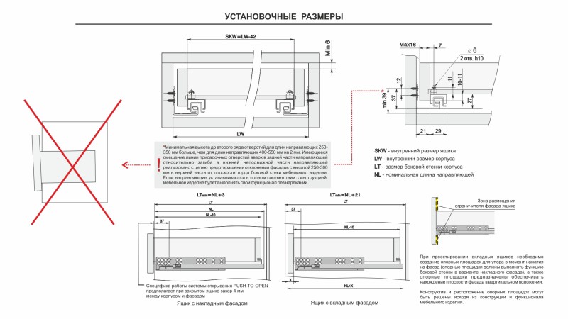 В направляющих предусмотрены дополнительные металлические упоры на подвижной и неподвижной частях направляющих для сдерживания давления в момент установки и в процессе эксплуатации. Это снижает риски излома механизма PUSH, а также избавляет от необходимости создания дополнительных упоров при создании выдвижных ящиков с вкладным типом фасадов.