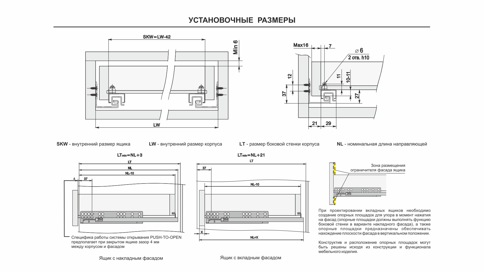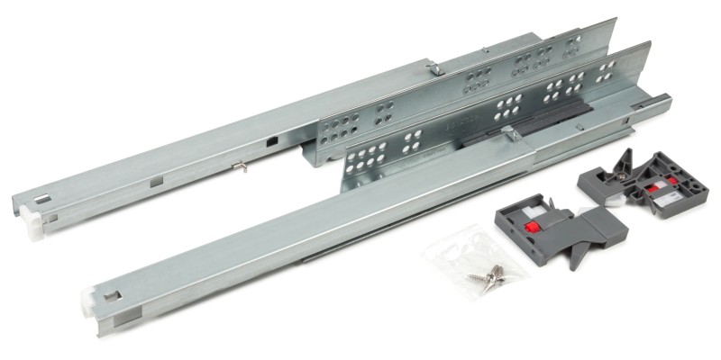 В направляющих предусмотрены дополнительные металлические упоры на подвижной и неподвижной частях направляющих для сдерживания давления в момент установки и в процессе эксплуатации. Это снижает риски излома механизма PUSH, а также избавляет от необходимости создания дополнительных упоров при создании выдвижных ящиков с вкладным типом фасадов.