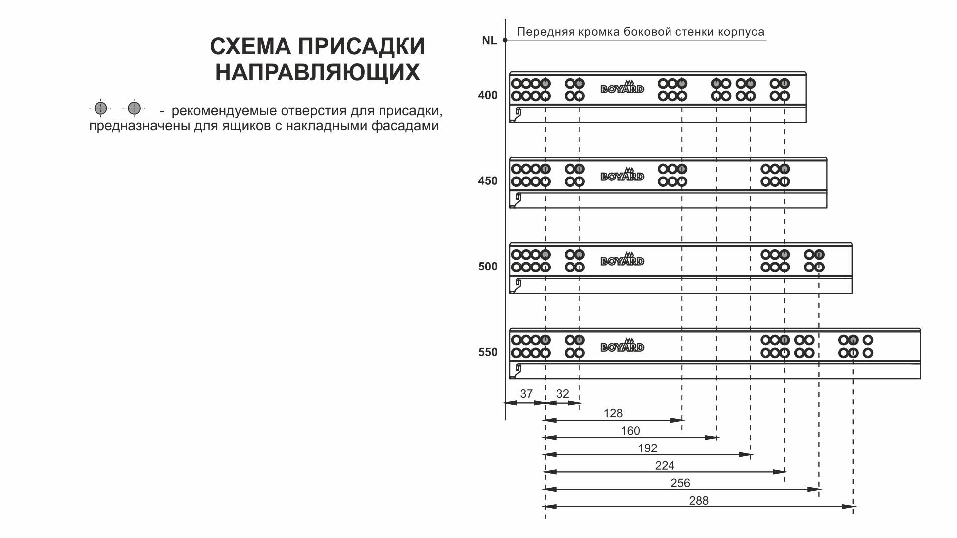 Раскрой и присадочные размеры идентичны направляющим скрытого монтажа Бислайд DB8881.