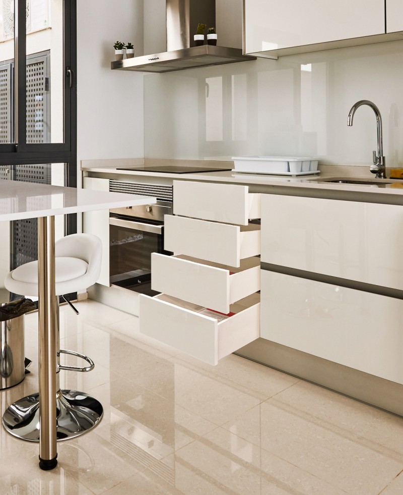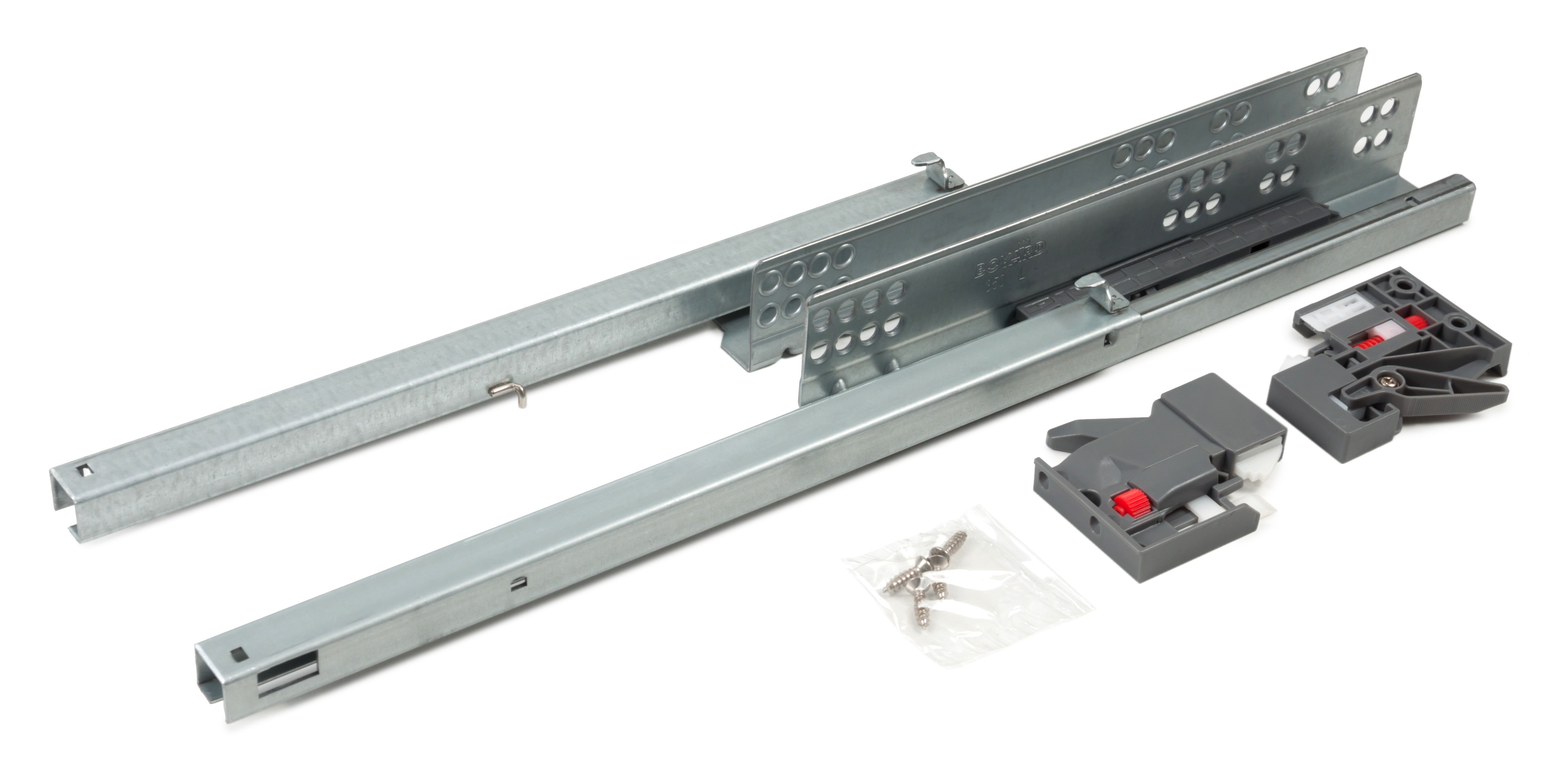 Направляющие скрытого монтажа неполного выдвижения с опцией открывания легким нажатием на фасад (push-to-open), со способом установки мебельного ящика при помощи надвижного монтажа.