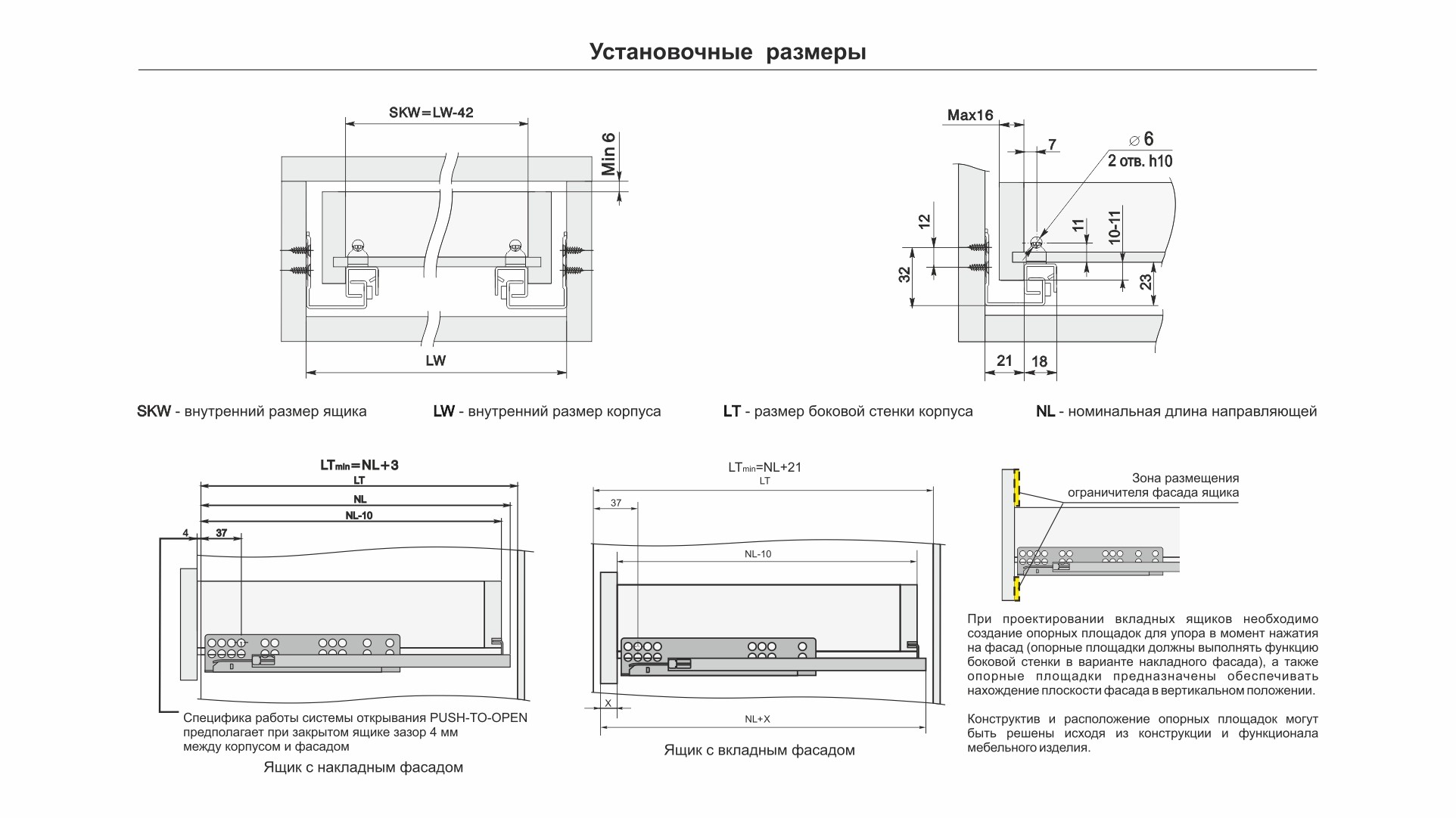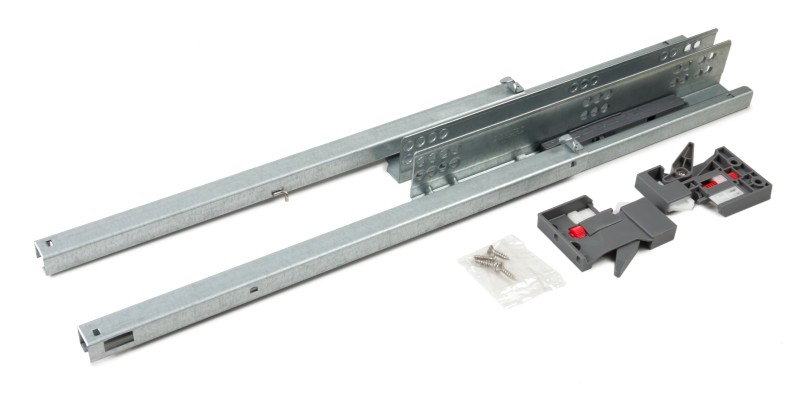 В направляющих предусмотрены дополнительные металлические упоры на подвижной и неподвижной частях направляющих для сдерживания давления в момент установки и в процессе эксплуатации. Это снижает риски излома механизма PUSH, а также избавляет от необходимости создания дополнительных упоров при создании выдвижных ящиков с вкладным типом фасадов.