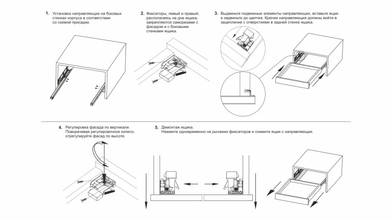 Направляющие скрытого монтажа неполного выдвижения с опцией открывания легким нажатием на фасад (push-to-open), со способом установки мебельного ящика при помощи надвижного монтажа.