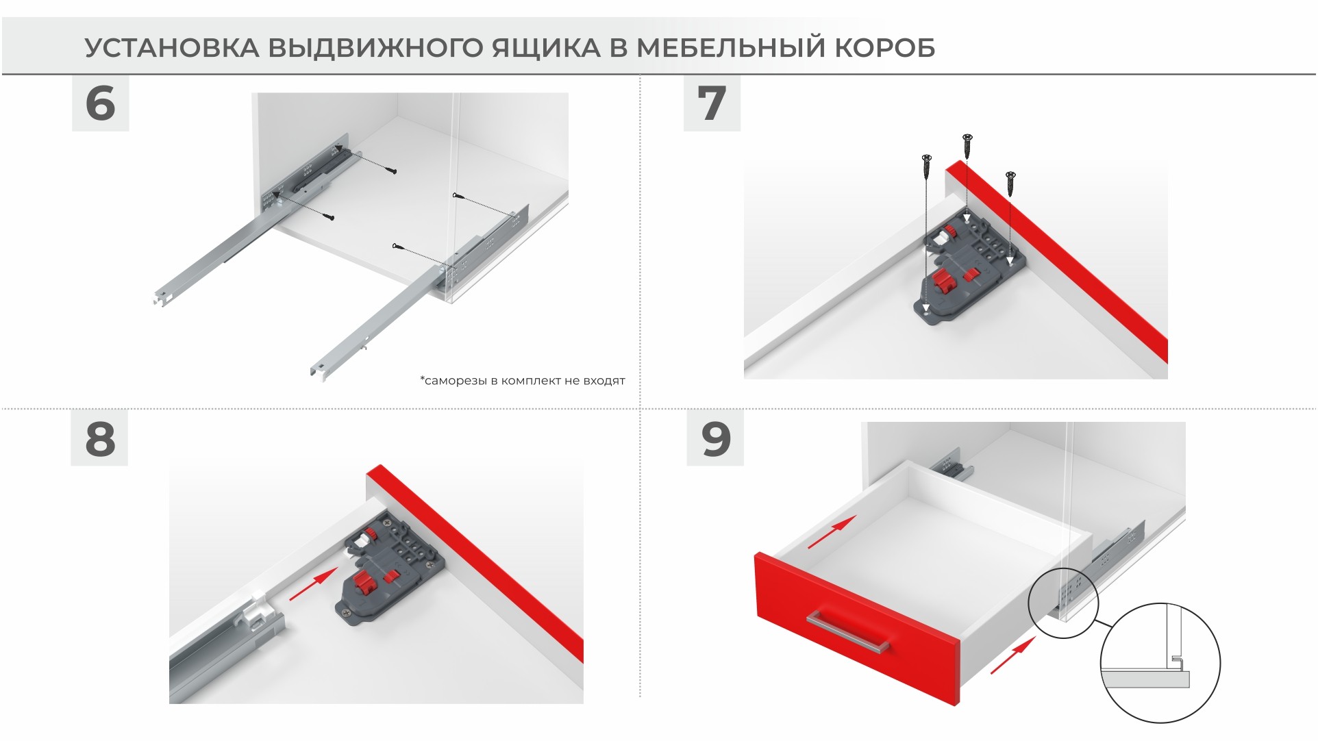 Следуя инструкции по установке направляющих, при создании внутренних ящиков или ящиков с вкладными фасадами не забудьте предусмотреть специальный ограничитель или упор, чтобы фасады всех ящиков выровнялись относительно боковых стенок корпуса и встали в одну линию.