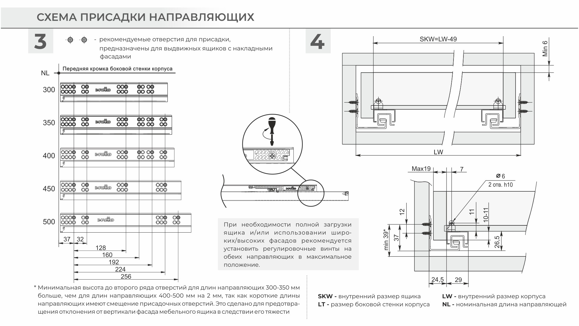 Разница в монтаже коротких и больших длин заключается в значении min отступа от дна мебельного корпуса до верхнего ряда присадочных отверстий направляющей. У неглубоких моделей, до 350 мм включительно, это значение составляет min 39 мм. Установка по схеме позволяет достичь зазора в 2 мм между мебельным корпусом и направляющей. Именно корректный монтаж, в соответствие со схемой, позволяет избежать отклонения фасада с высотой 250-300 мм в верхней части от плоскости торца боковой стенки мебельного изделия.