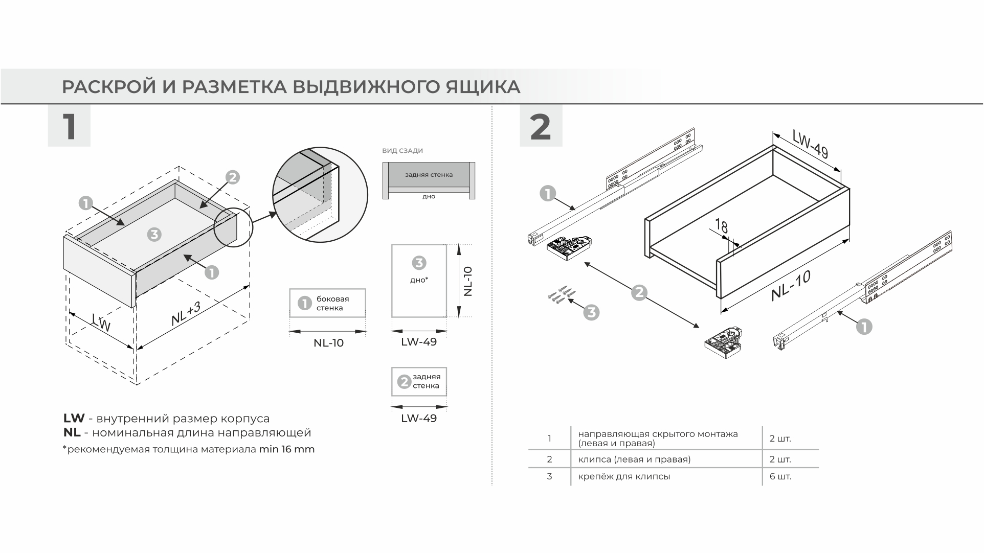 Разница в монтаже коротких и больших длин заключается в значении min отступа от дна мебельного корпуса до верхнего ряда присадочных отверстий направляющей. У неглубоких моделей, до 350 мм включительно, это значение составляет min 39 мм. Установка по схеме позволяет достичь зазора в 2 мм между мебельным корпусом и направляющей. Именно корректный монтаж, в соответствие со схемой, позволяет избежать отклонения фасада с высотой 250-300 мм в верхней части от плоскости торца боковой стенки мебельного изделия.