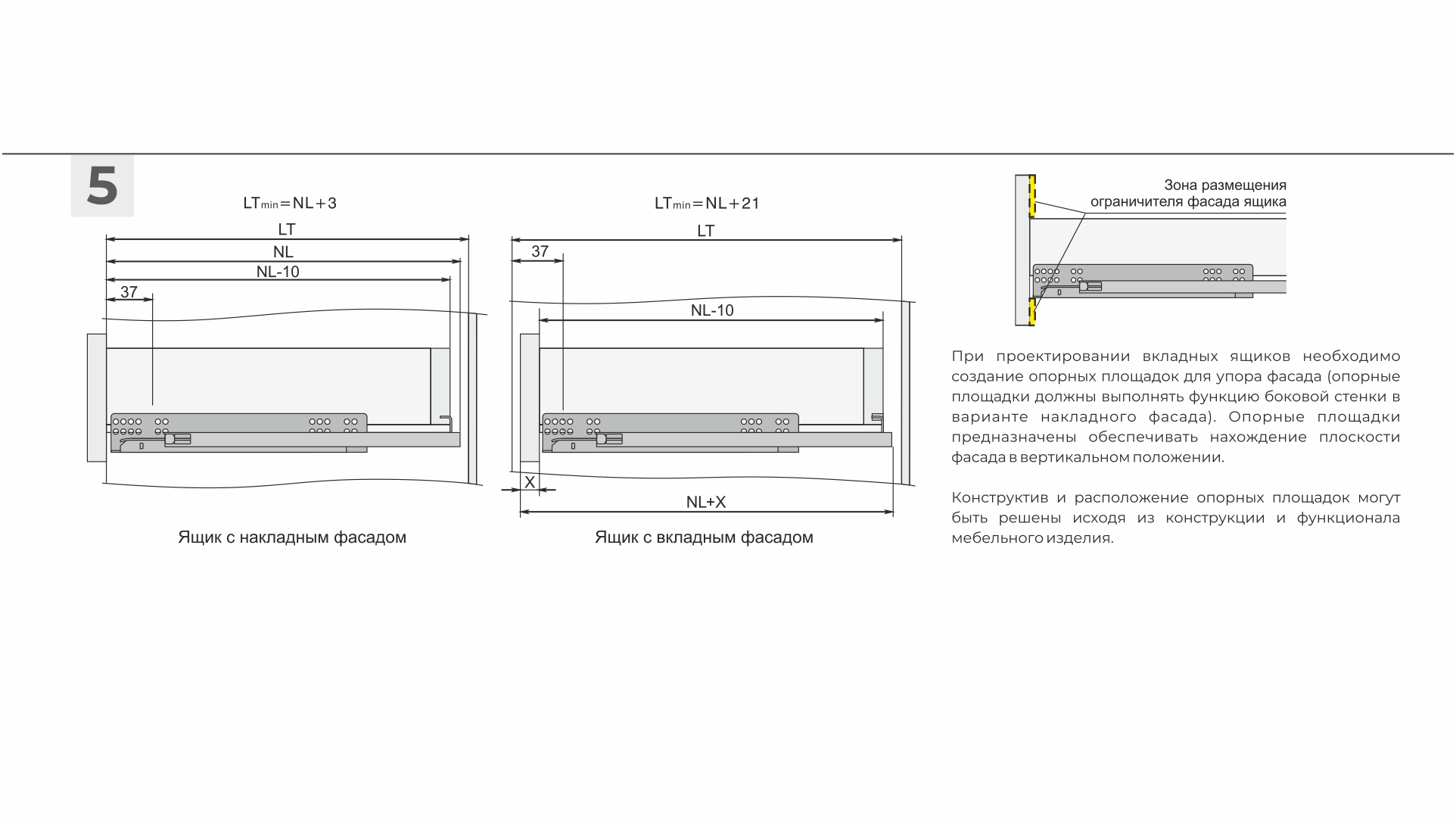 Следуя инструкции по установке направляющих, при создании внутренних ящиков или ящиков с вкладными фасадами не забудьте предусмотреть специальный ограничитель или упор, чтобы фасады всех ящиков выровнялись относительно боковых стенок корпуса и встали в одну линию.