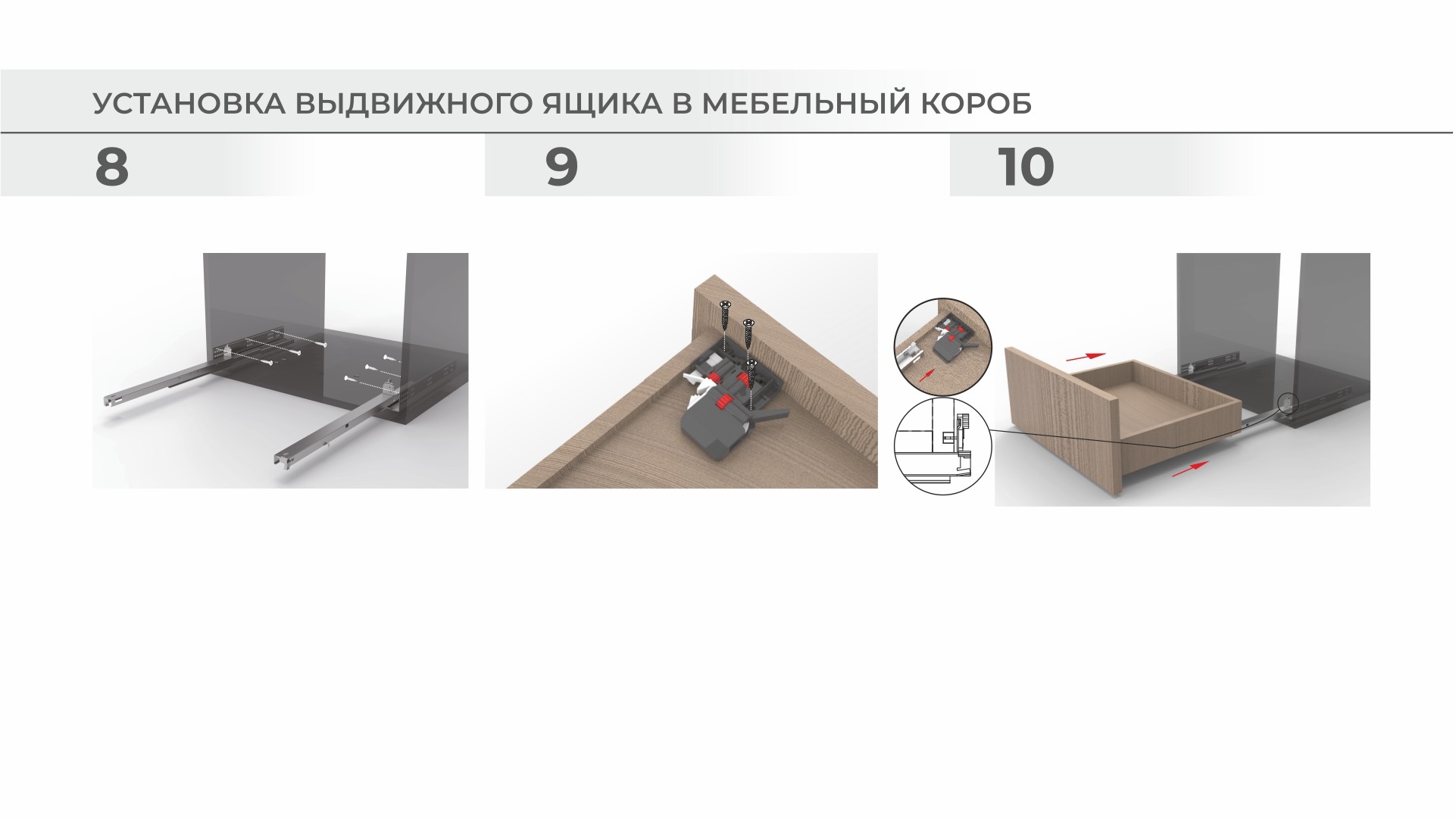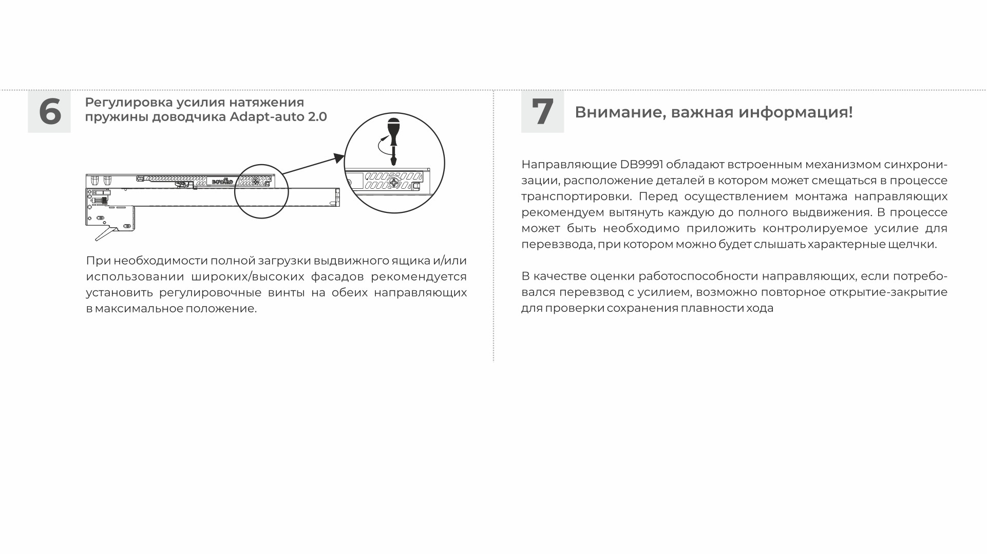 Направляющие DB9991 обладают встроенным механизмом синхронизации, расположение деталей в котором может смещаться в процессе транспортировки. Перед осуществлением монтажа направляющих рекомендуем вытянуть каждую до полного выдвижения. В процессе может быть необходимо приложить контролируемое усилие для перевзвода, при котором можно будет слышать характерные щелчки.