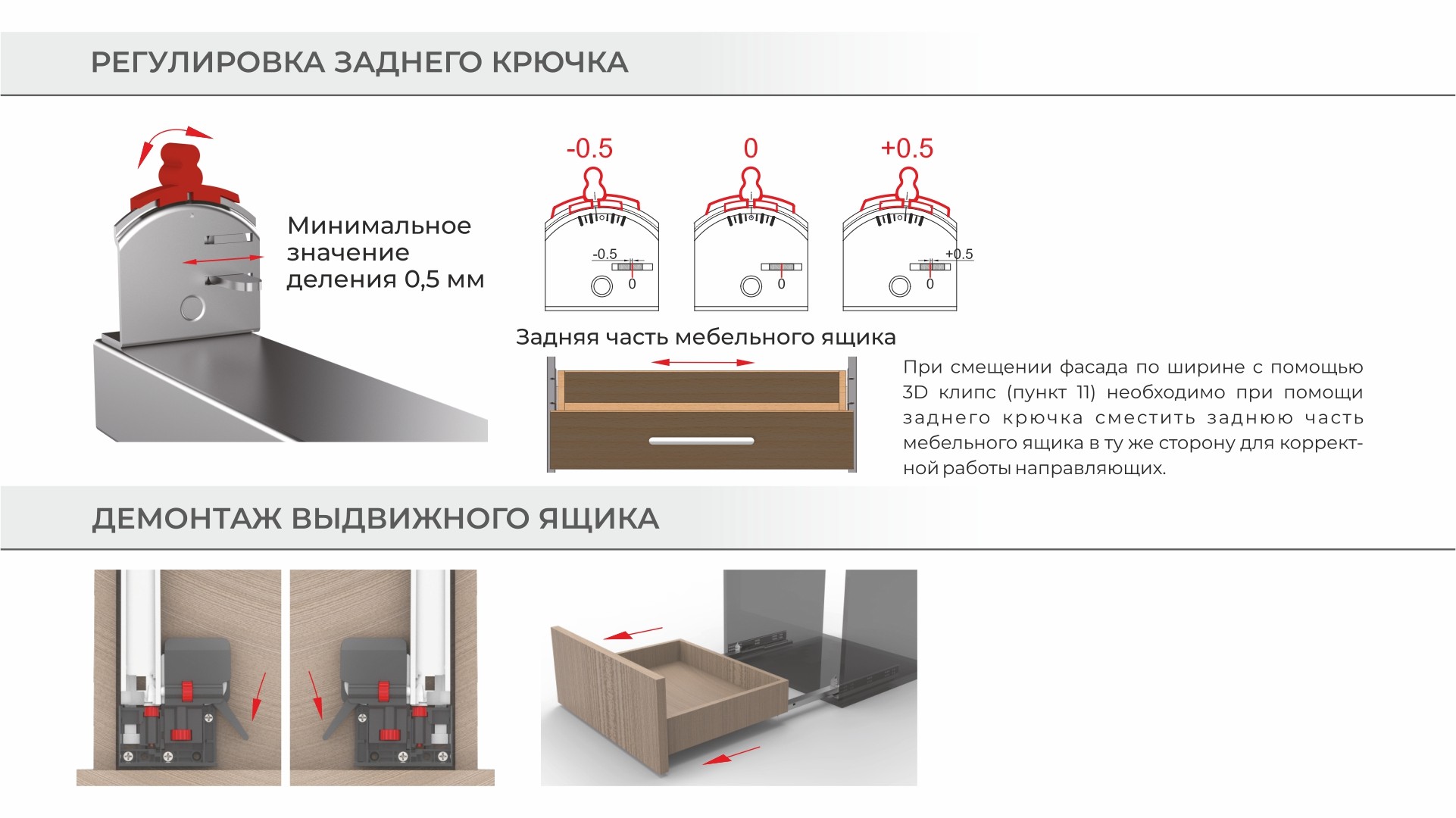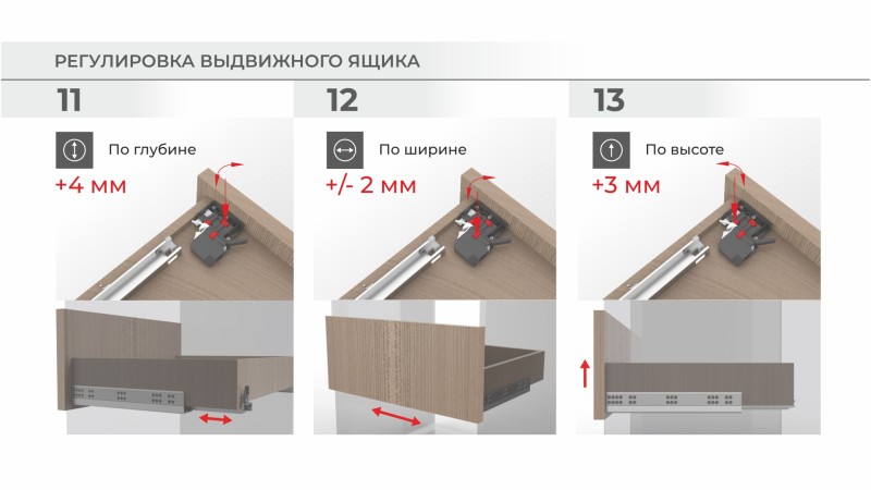 B-Slide DB9991 — направляющие скрытого монтажа полного выдвижения с 3D-регулировкой и синхронизацией. Реальная корректная и полноценная 3d-регулировка с помощью клипсы и подвижного заднего крючка позволит легко уточнить положение мебельного ящика или компенсировать возможные погрешности монтажа без применения доп. инструмента и без ухудшений параметров комфортного хода.
