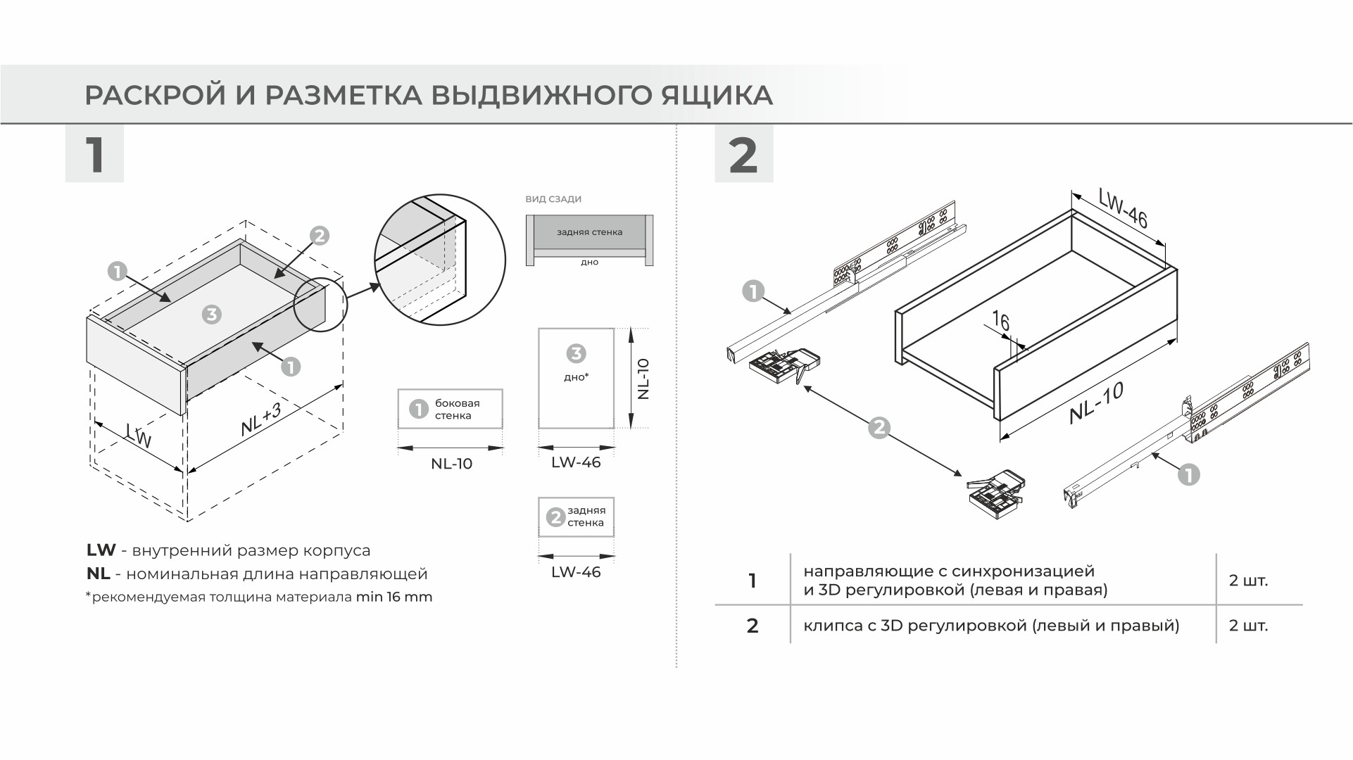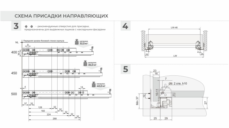 Схема установки DB9991 с короткой монтажной длиной 300-350 мм отличается от схемы установки размеров 400-500 мм. При нанесении разметки на корпус мебели чётко следуйте инструкции! Разница в монтаже коротких и больших длин заключается в значении min отступа от дна мебельного корпуса до верхнего ряда присадочных отверстий направляющей. У неглубоких моделей, до 350 мм включительно, это значение составляет min 39 мм. Установка по схеме позволяет достичь зазора в 2 мм между мебельным корпусом и направляющей. Именно корректный монтаж в соответствие со схемой позволяет избежать отклонения фасада с высотой 250-300 мм в верхней части от плоскости торца боковой стенки мебельного изделия.