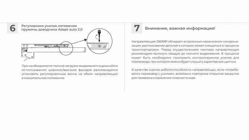 Adapt-auto — адаптивная регулировка усилия работы доводчика — уникальное технологическое решение BOYARD, которое позволяет легко и быстро «в домашних условиях» ослабить или усилить натяжение пружины доводчика. Опция Adapt-auto незаменима в случае нестандартной нагрузки, когда неглубокий ящик имеет высокий и тяжелый фасад, или же когда груз внутри ящика распределен ближе к фасаду. В случае многолетней активной эксплуатации мебели пружину доводчика можно подтянуть, и доводчик будет работать как в день установки направляющих. Усиливать или облегчать натяжение пружины пользователи мебели могут самостоятельно, выставив подходящее положение регулировочного винта в доводчике при помощи обычной крестовой отвертки.