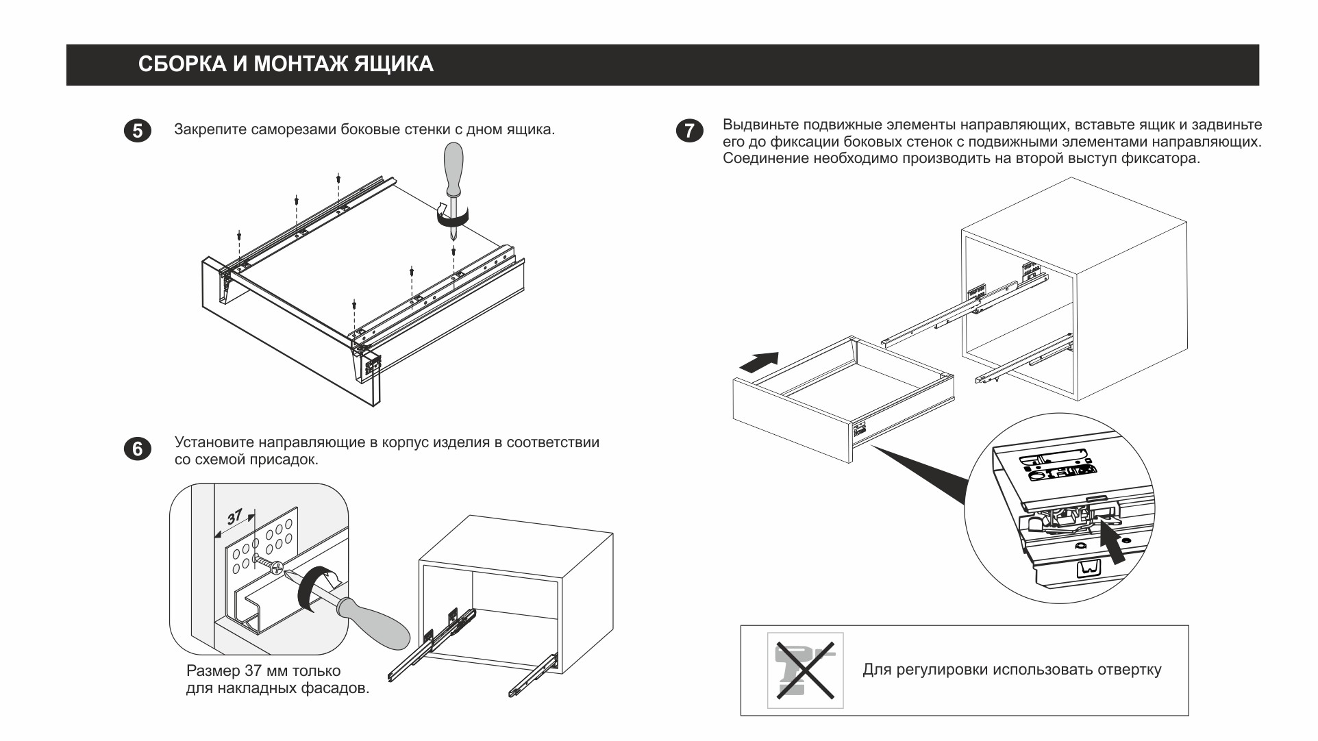 Системы выдвижения СТАРТ PUSH обладают специальным металлическим ограничителем, препятствующим поломке механизма PUSH при монтаже выдвижного ящика на направляющие и при использовании с вкладным фасадом. В то же время, как и любой другой механизм, они не защищены от поломки при приложении чрезмерной силы во время закрывания мебельного ящика, так как не обладают механизмом SOFT. Во избежание преждевременной поломки направляющих или их составных частей, мы рекомендуем доводить выдвижной ящик рукой до положения "закрыто", а не толкать с разной неконтролируемой силой в ожидании его самостоятельной фиксации в закрытом положении.