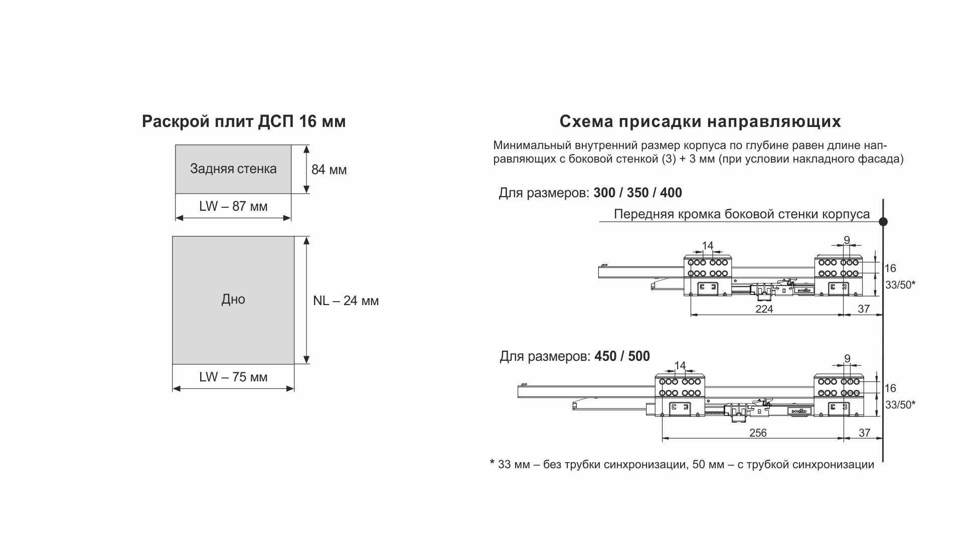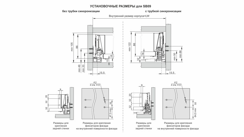Для сборки выдвижного мебельного ящика на базе СТАРТ PUSH SB09 необходимо самостоятельно изготовить фасад, заднюю стенку и дно ящика.