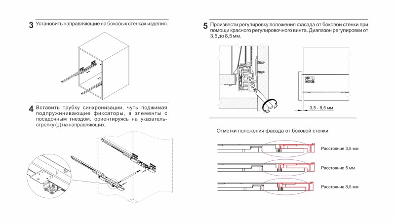 Конструкция СТАРТ PUSH SB09 имеет регулировочный красный винт — он позволяет выровнять фасады по глубине и компенсировать погрешности производства и монтажа. Специальные риски на направляющей помогут выставить одинаковое положение регулировки на обеих направляющих (левой и правой).