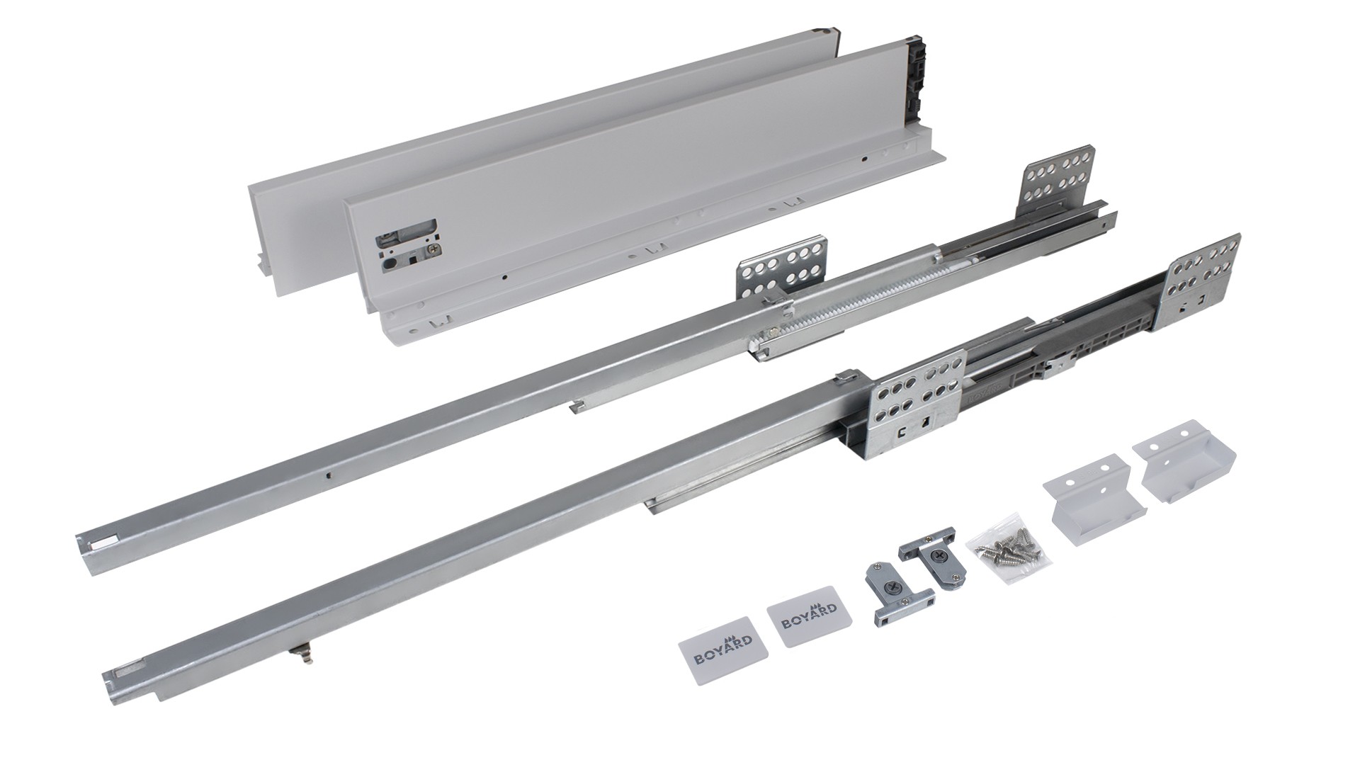 СТАРТ СОФТ SB18 — комплект систем выдвижения для сборки выдвижного мебельного ящика с прямыми боковинами стандартной высоты 86 мм для минимальной высоты проёма 115 мм.
