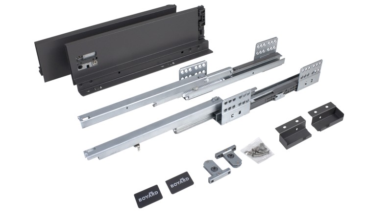 СТАРТ SOFT SB18 — комплект систем выдвижения для сборки выдвижного мебельного ящика с прямыми боковинами стандартной высоты 86 мм для минимальной высоты проёма 115 мм.