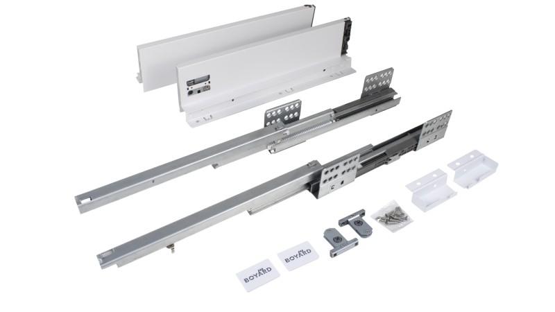 СТАРТ SOFT SB18 — комплект систем выдвижения для сборки выдвижного мебельного ящика с прямыми боковинами стандартной высоты 86 мм для минимальной высоты проёма 115 мм.