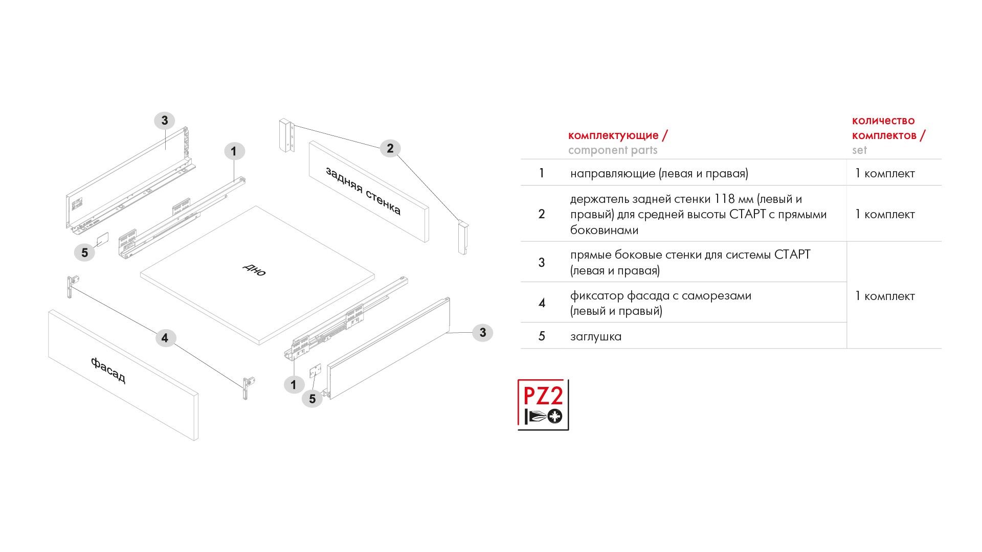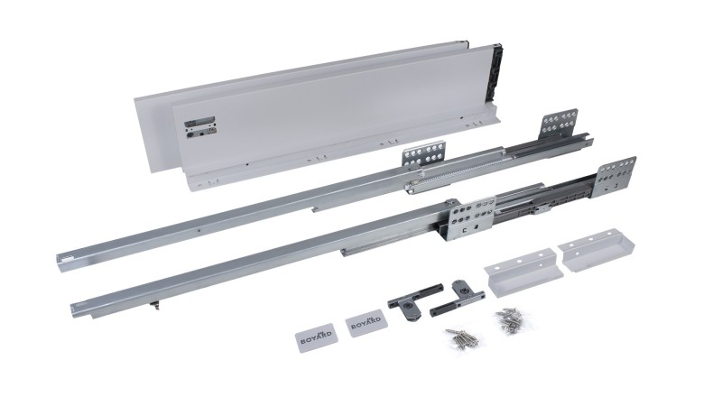 СТАРТ SOFT SB19 — комплект систем выдвижения для сборки выдвижного мебельного ящика с прямыми боковинами средней высоты 118 мм для минимальной высоты проёма 147 мм.