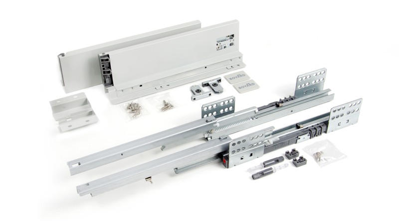 СТАРТ PUSH SB28 — комплект систем выдвижения для сборки выдвижного мебельного ящика с прямыми боковинами стандартной высоты с открытием от нажатия для мебели без ручек.