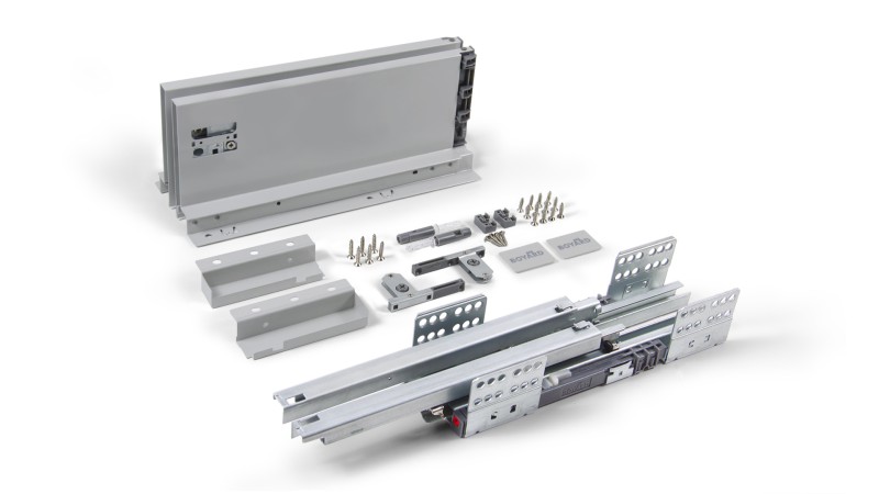 СТАРТ PUSH SB29 — комплект систем выдвижения для сборки выдвижного мебельного ящика с прямыми боковинами средней высоты с открытием от нажатия для мебели без ручек.