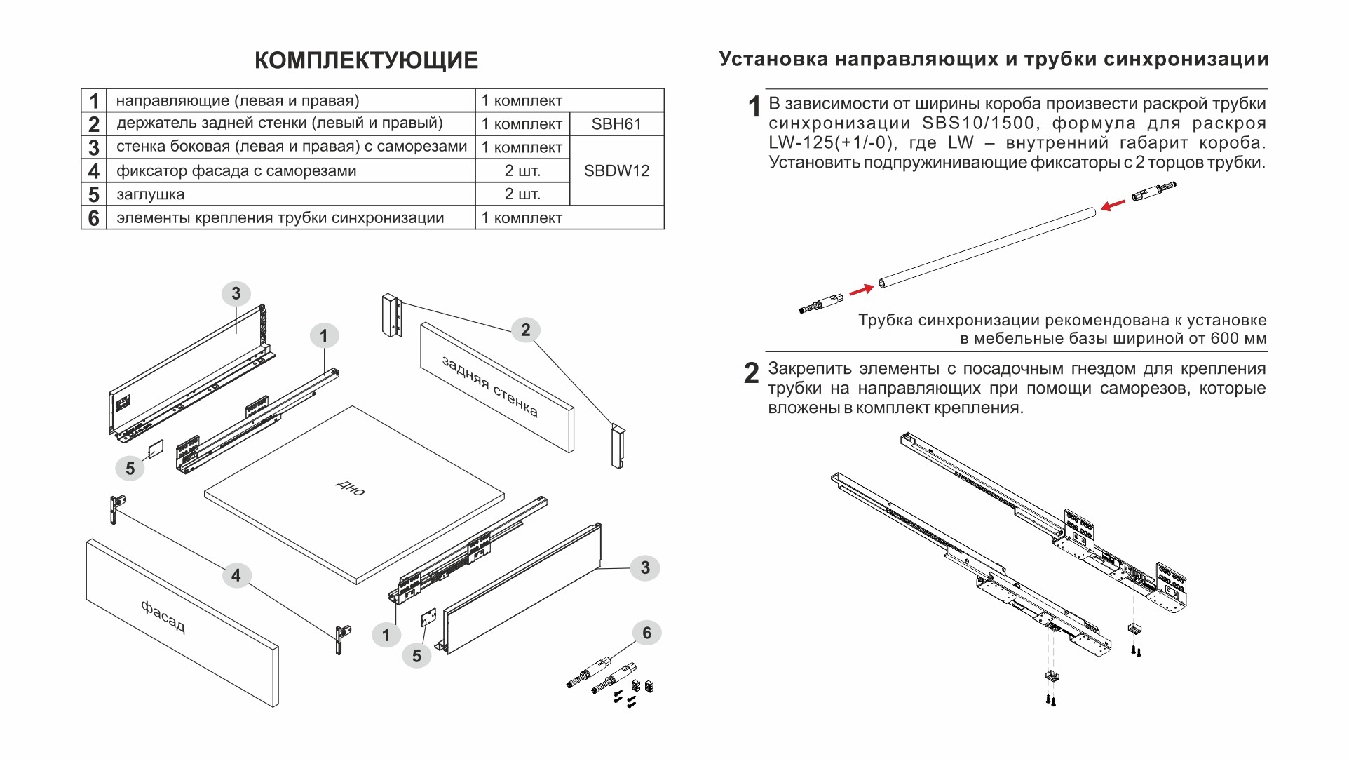 Для срабатывания механизма PUSH в любой точке фасада на широких ящиках (от 600 мм) рекомендуется устанавливать поворотную синхронизирующую трубку SBS10/1500 (приобретается отдельно).