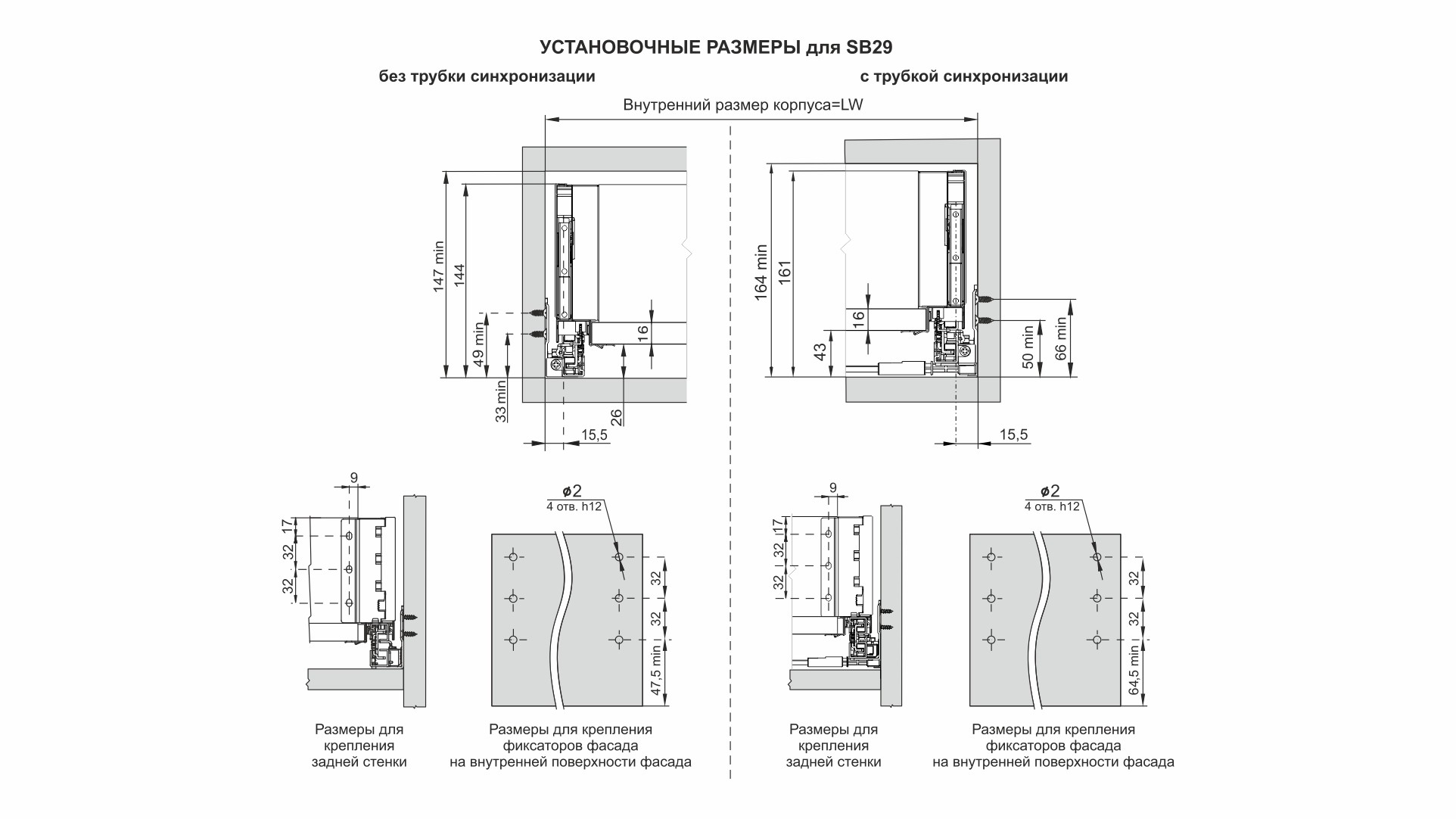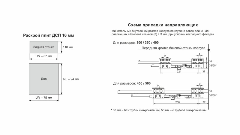 Для сборки выдвижного мебельного ящика на базе СТАРТ PUSH SB29 необходимо самостоятельно изготовить фасад, заднюю стенку и дно ящика.