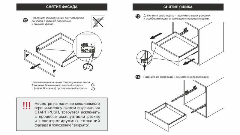 Системы выдвижения СТАРТ PUSH обладают специальным металлическим ограничителем, препятствующим поломке механизма PUSH при монтаже выдвижного ящика на направляющие и при использовании с вкладным фасадом. В то же время, как и любой другой механизм, они не защищены от поломки при приложении чрезмерной силы во время закрывания мебельного ящика, так как не обладают механизмом SOFT. Во избежание преждевременной поломки направляющих или их составных частей, мы рекомендуем доводить выдвижной ящик рукой до положения "закрыто", а не толкать с разной неконтролируемой силой в ожидании его самостоятельной фиксации в закрытом положении.