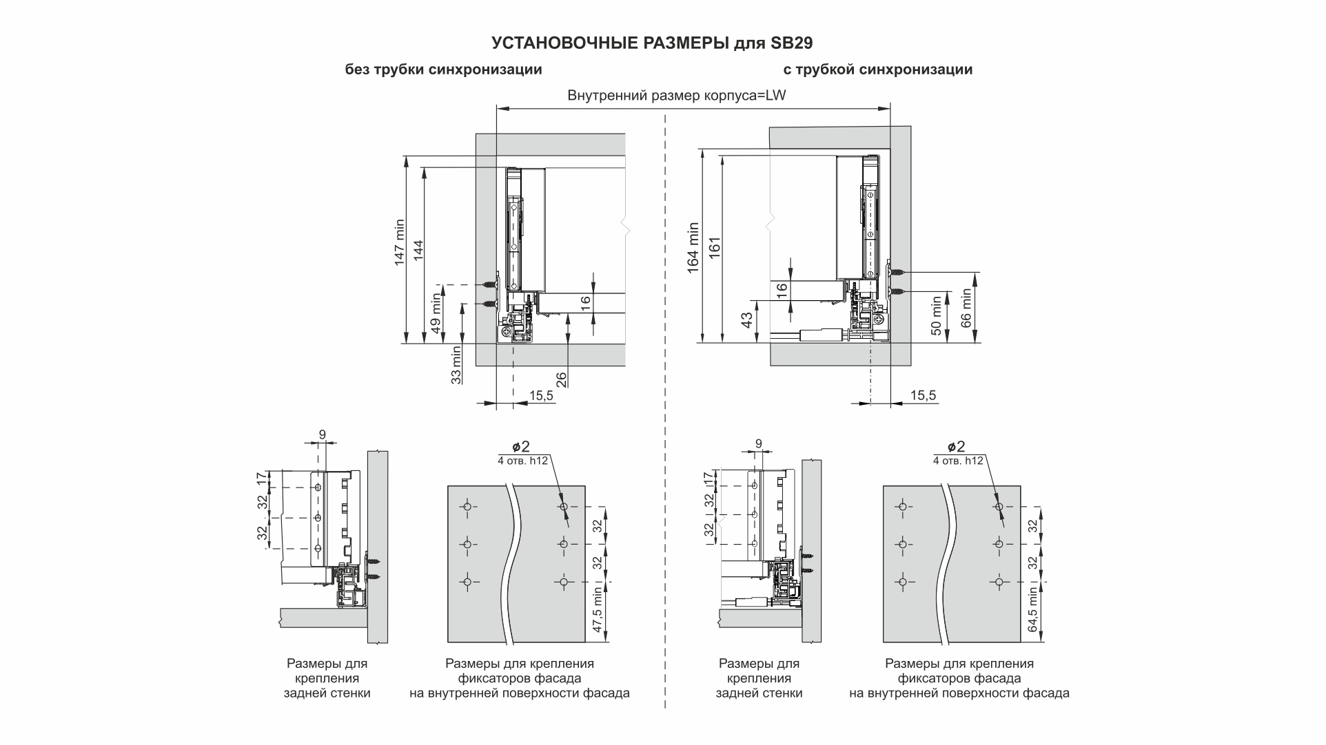 Комплект СТАРТ PUSH SB29 позволяет создавать выдвижные мебельные ящики любой желаемой высоты с помощью дополнительных рейлингов круглой или прямоугольной формы и держателей к ним, которые приобретаются отдельно.