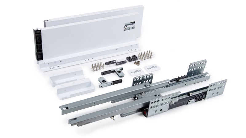СТАРТ PUSH SB29 — комплект систем выдвижения для сборки выдвижного мебельного ящика с прямыми боковинами средней высоты с открытием от нажатия для мебели без ручек.