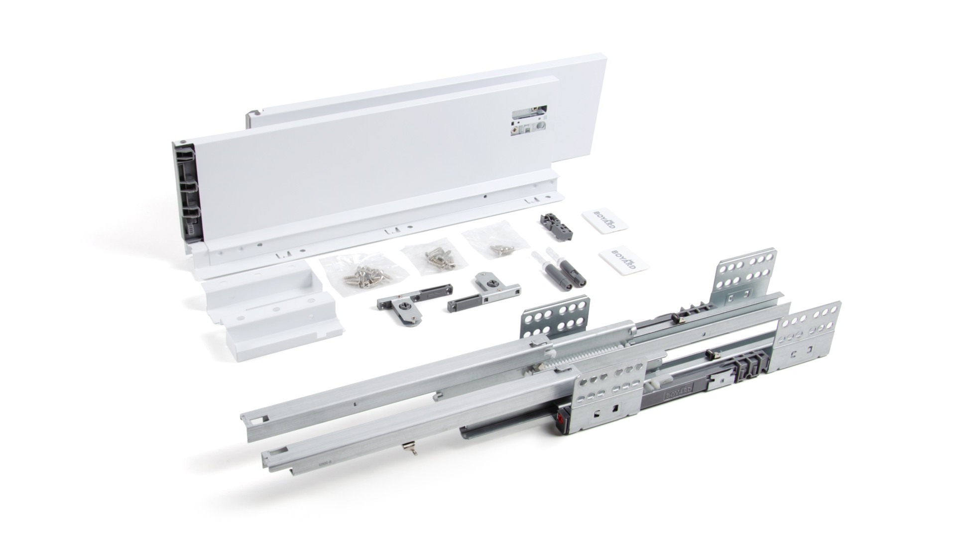 СТАРТ ПУШ SB29 — комплект систем выдвижения для сборки выдвижного мебельного ящика с прямыми боковинами средней высоты с открытием от нажатия для мебели без ручек.