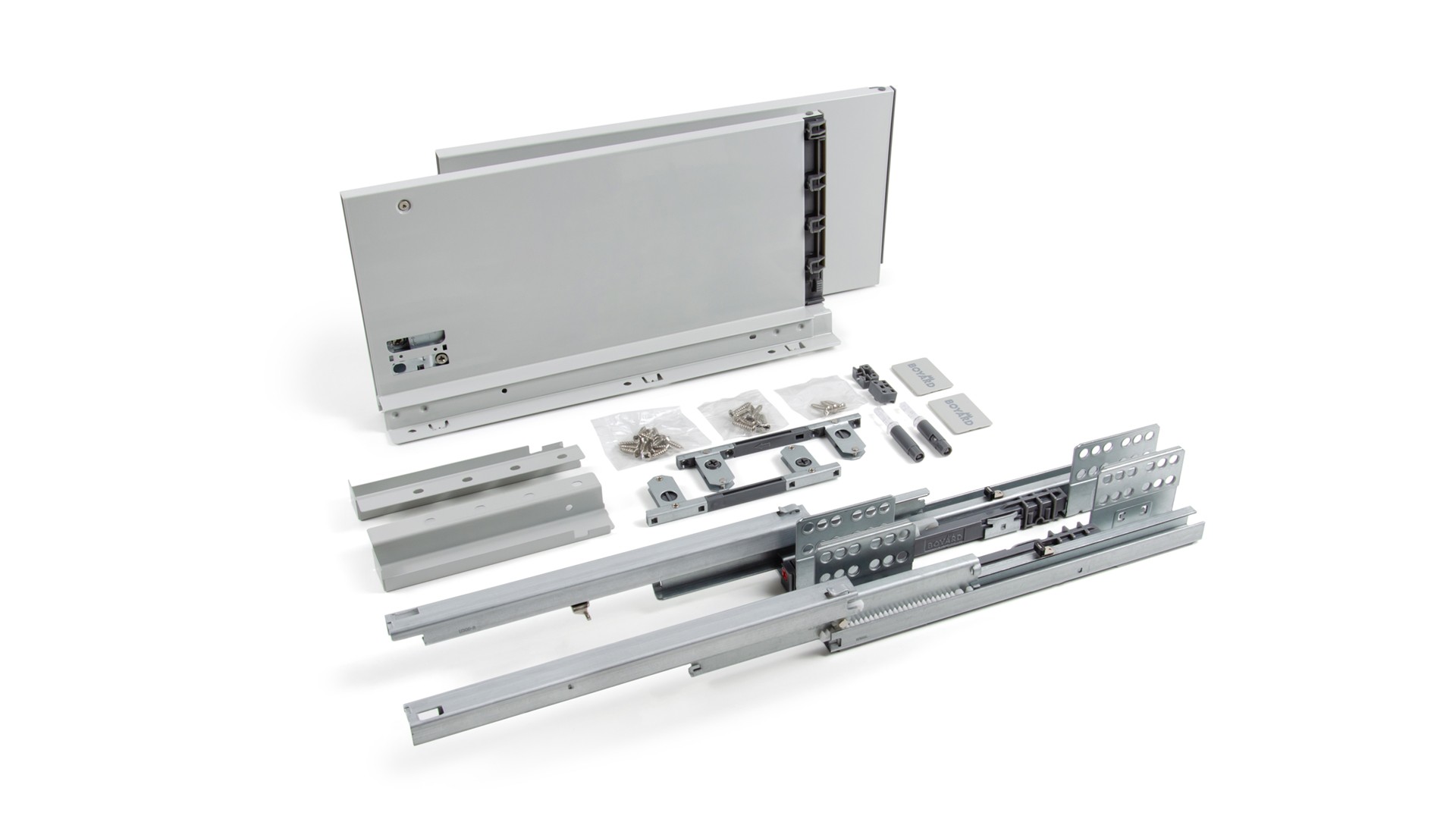 СТАРТ ПУШ SB30 — комплект систем выдвижения для сборки высокого выдвижного мебельного ящика с прямыми боковинами с открытием от нажатия для мебели без ручек.