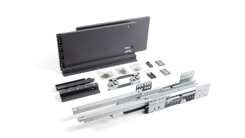 СТАРТ ПУШ SB30 — комплект систем выдвижения для сборки высокого выдвижного мебельного ящика с прямыми боковинами с открытием от нажатия для мебели без ручек.