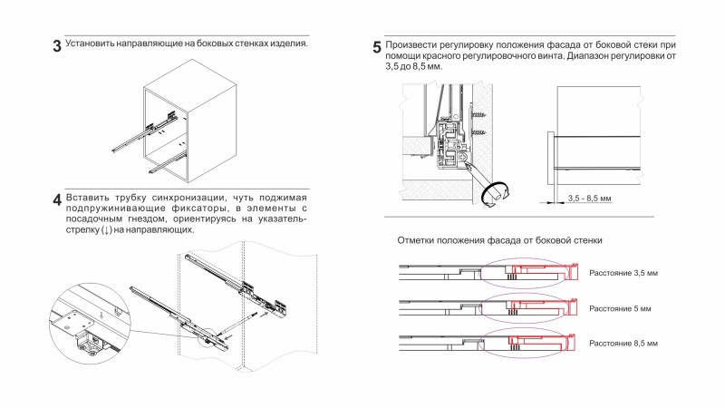 Конструкция СТАРТ PUSH SB30 имеет регулировочный красный винт — он позволяет выровнять фасады по глубине и компенсировать погрешности производства и монтажа. Специальные риски на направляющей помогут выставить одинаковое положение регулировки на обеих направляющих (левой и правой).