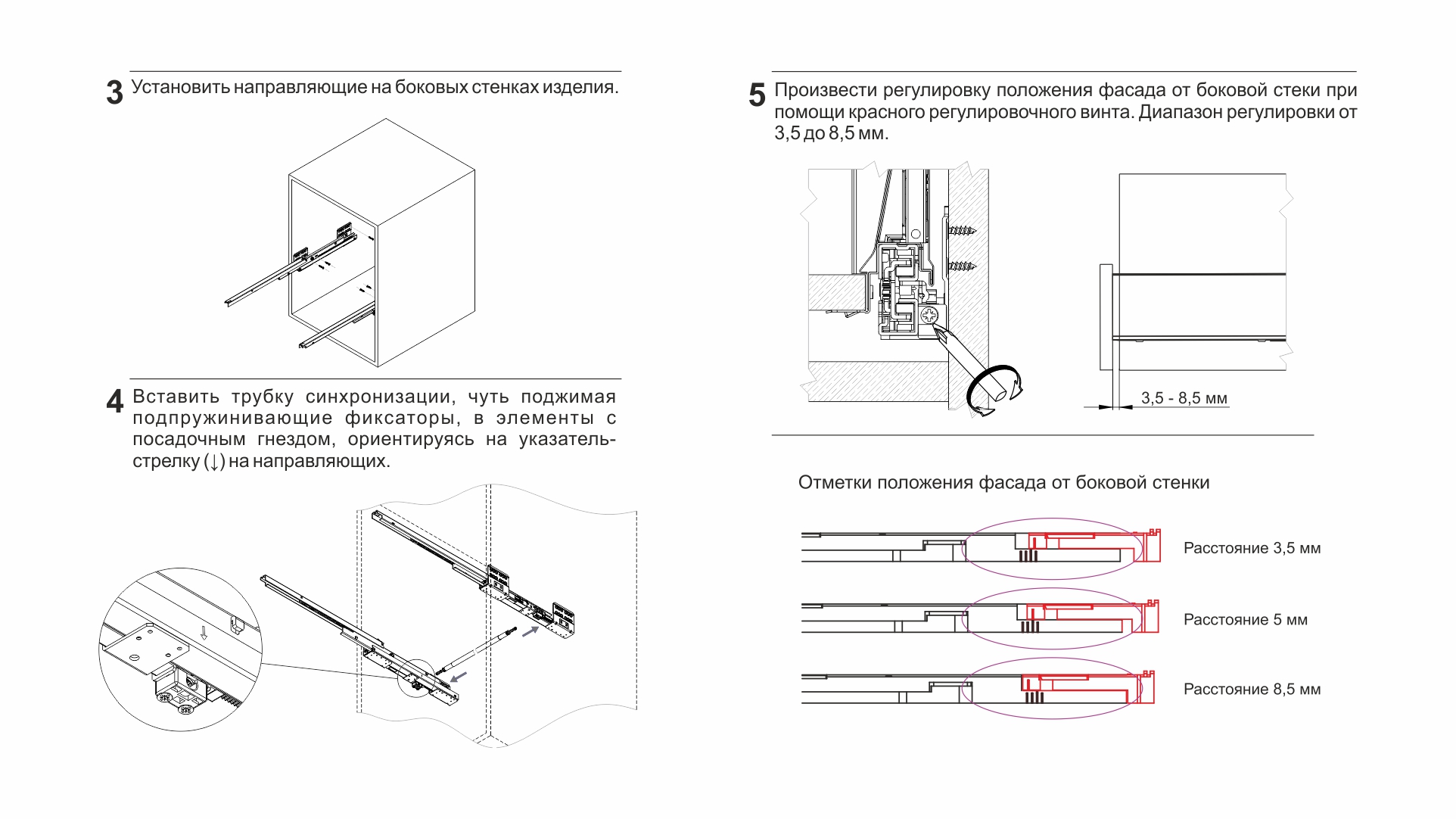 Конструкция СТАРТ PUSH SB30 имеет регулировочный красный винт — он позволяет выровнять фасады по глубине и компенсировать погрешности производства и монтажа. Специальные риски на направляющей помогут выставить одинаковое положение регулировки на обеих направляющих (левой и правой).