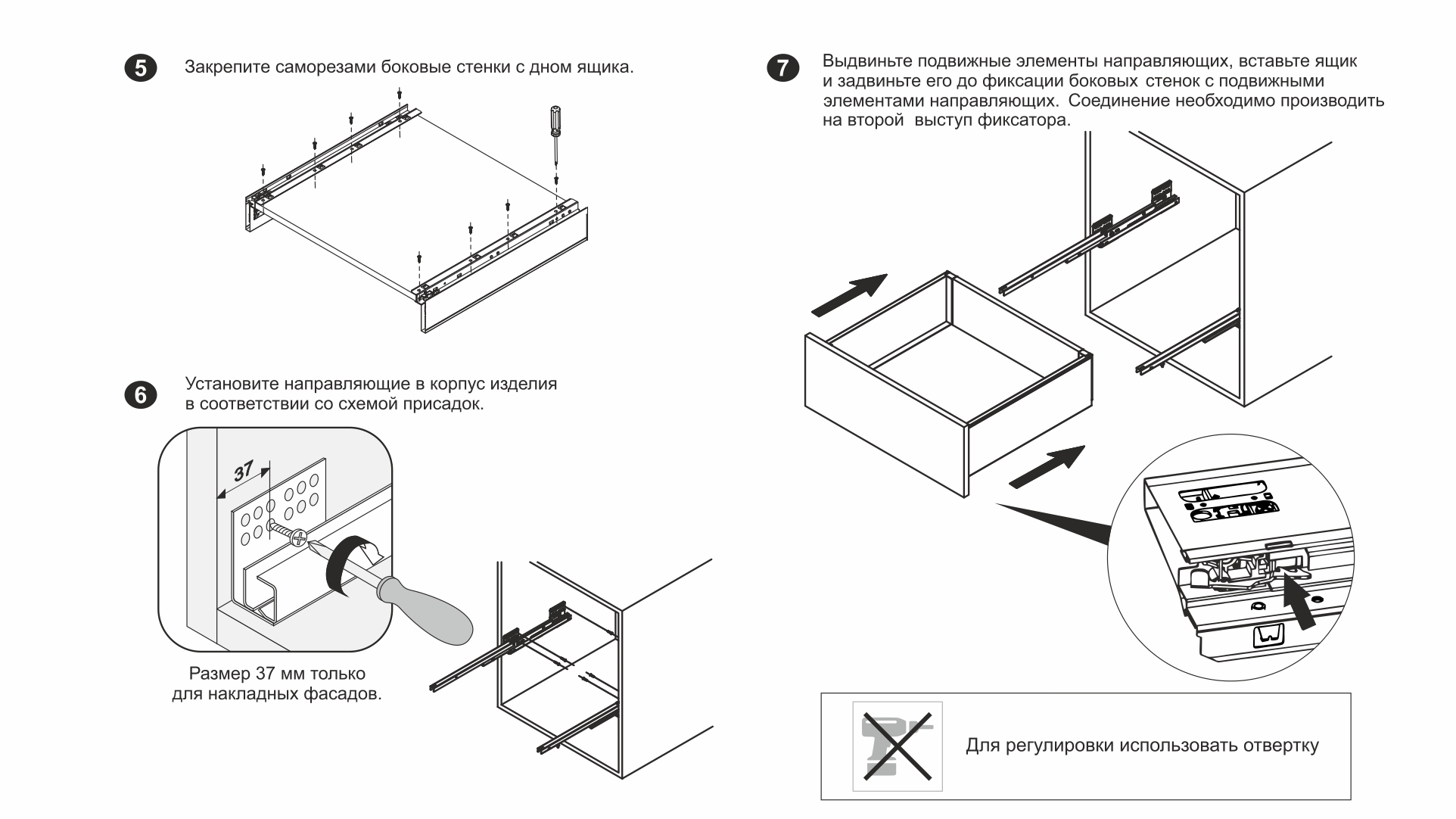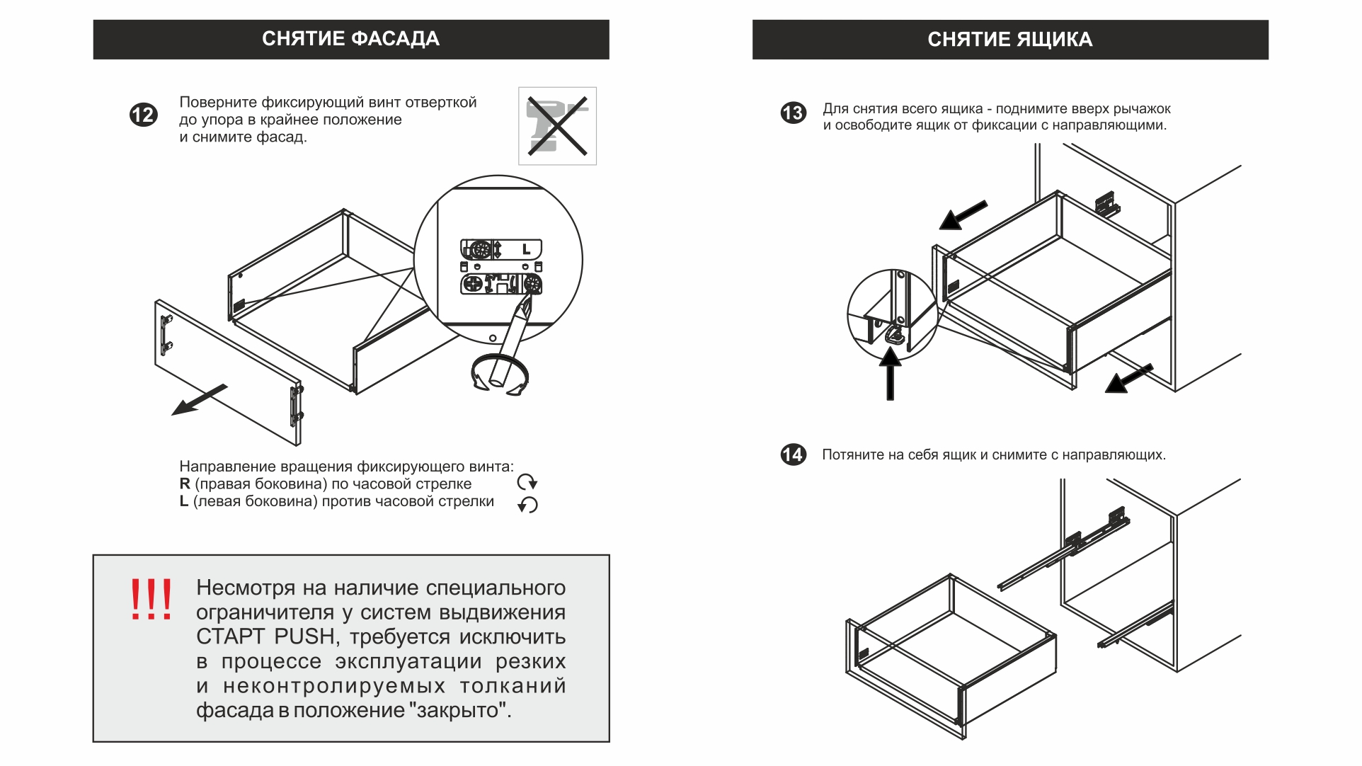 Системы выдвижения СТАРТ PUSH обладают специальным металлическим ограничителем, препятствующим поломке механизма PUSH при монтаже выдвижного ящика на направляющие и при использовании с вкладным фасадом. В то же время, как и любой другой механизм, они не защищены от поломки при приложении чрезмерной силы во время закрывания мебельного ящика, так как не обладают механизмом SOFT. Во избежание преждевременной поломки направляющих или их составных частей, мы рекомендуем доводить выдвижной ящик рукой до положения "закрыто", а не толкать с разной неконтролируемой силой в ожидании его самостоятельной фиксации в закрытом положении.