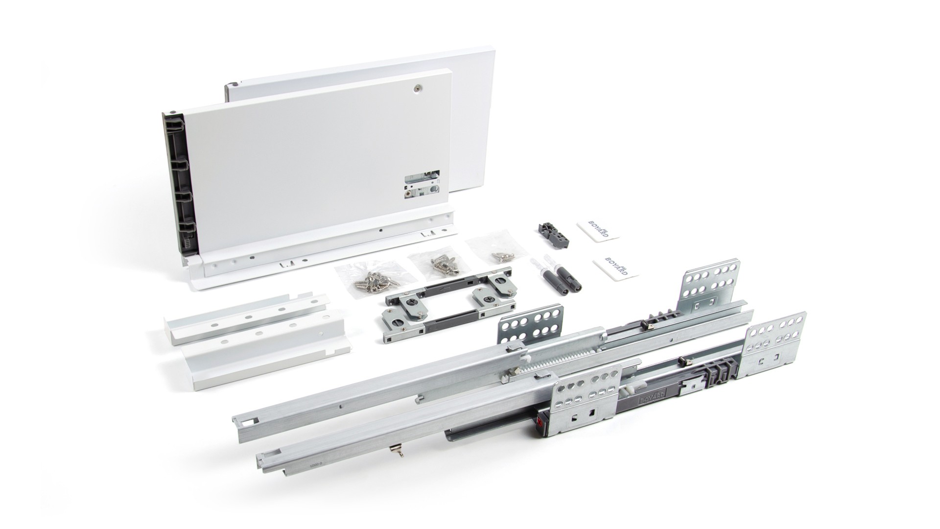 СТАРТ ПУШ SB30 — комплект систем выдвижения для сборки высокого выдвижного мебельного ящика с прямыми боковинами с открытием от нажатия для мебели без ручек.