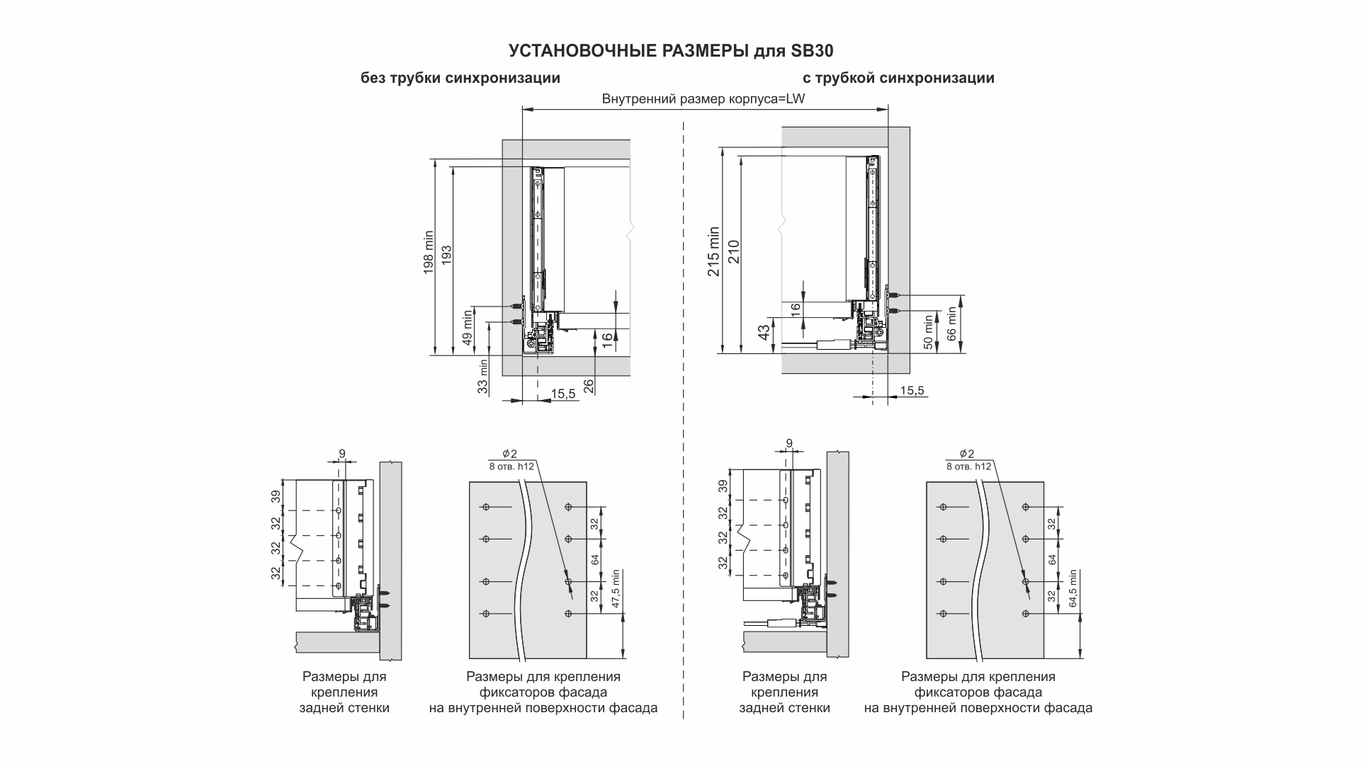 СТАРТ PUSH SB30 — комплект систем выдвижения для сборки высокого выдвижного мебельного ящика с прямыми боковинами с открытием от нажатия для мебели без ручек.