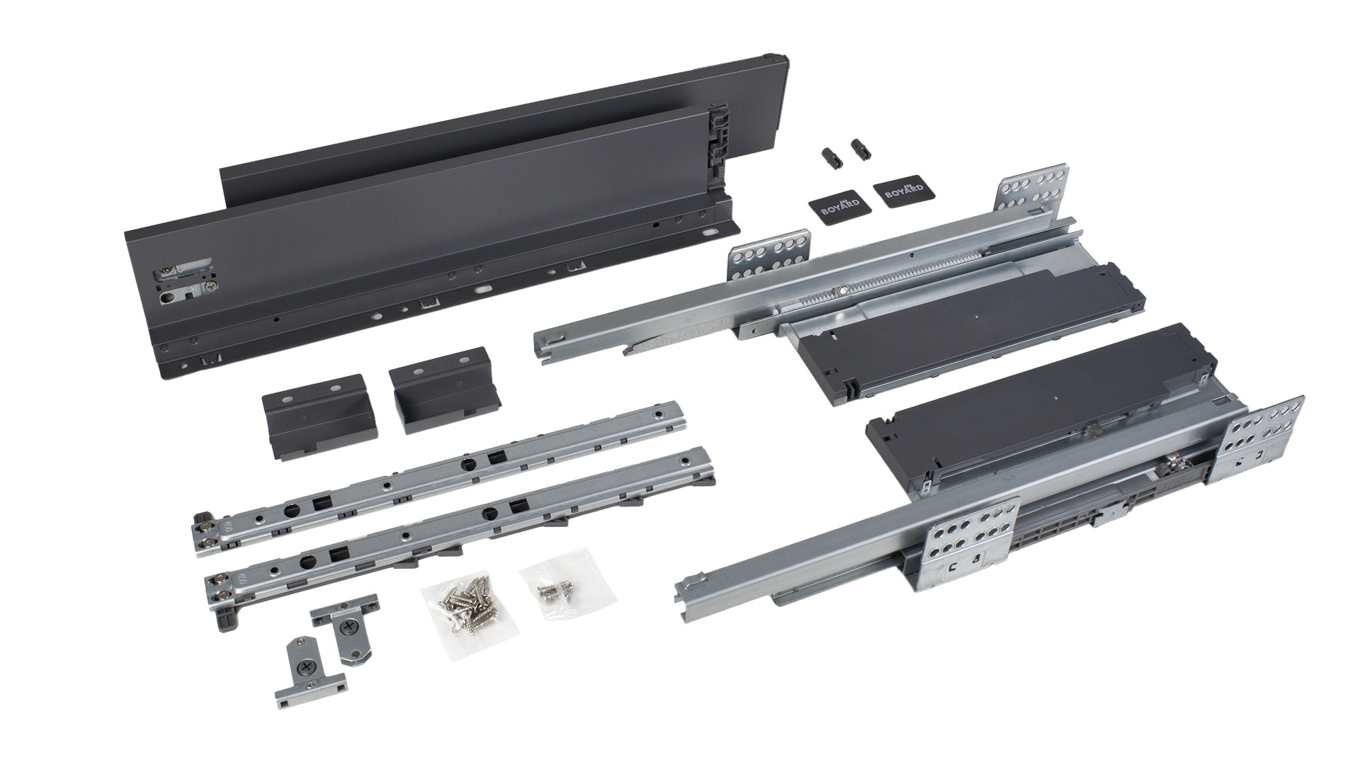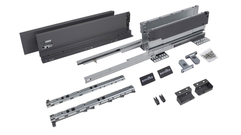 Для сборки выдвижного мебельного ящика на базе СТАРТ PUSH+SOFT SB38 необходимо самостоятельно изготовить фасад, заднюю стенку и дно мебельного ящика. Дополнительные рейлинги позволяют увеличить полезную высоту боковых стенок выдвижного ящика. Рейлинги и держатели к ним приобретаются отдельно.