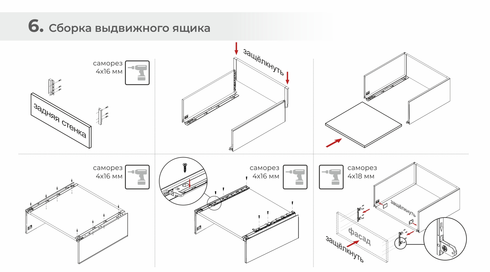 - Фиксаторы фасада с саморезами (левый и правый)