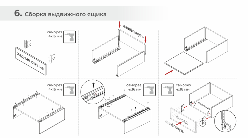 Сборка выдвижного ящика СТАРТ ПУШ+СОФТ проводится по аналогии со сборкой других типов СТАРТ, за исключением одного момента: при креплении боковины ко дну выдвижного ящика необходимо дополнительно прикрепить рейку ответной части механизма ПУШ через пластину крепления боковой стенки. Для простоты процесса на рейке предусмотрены специальные выступы, которые входят в отверстия пластины боковой стенки.