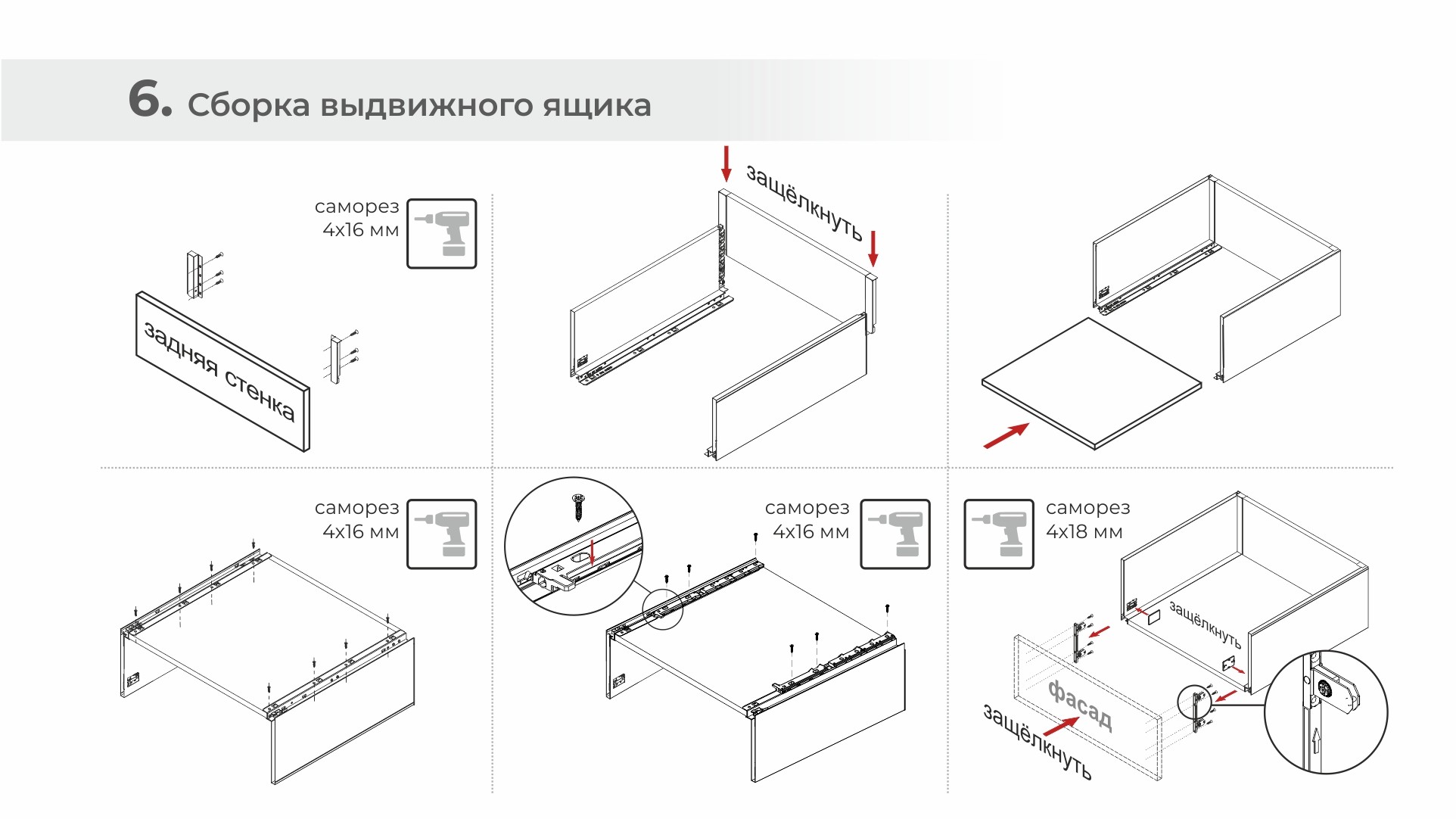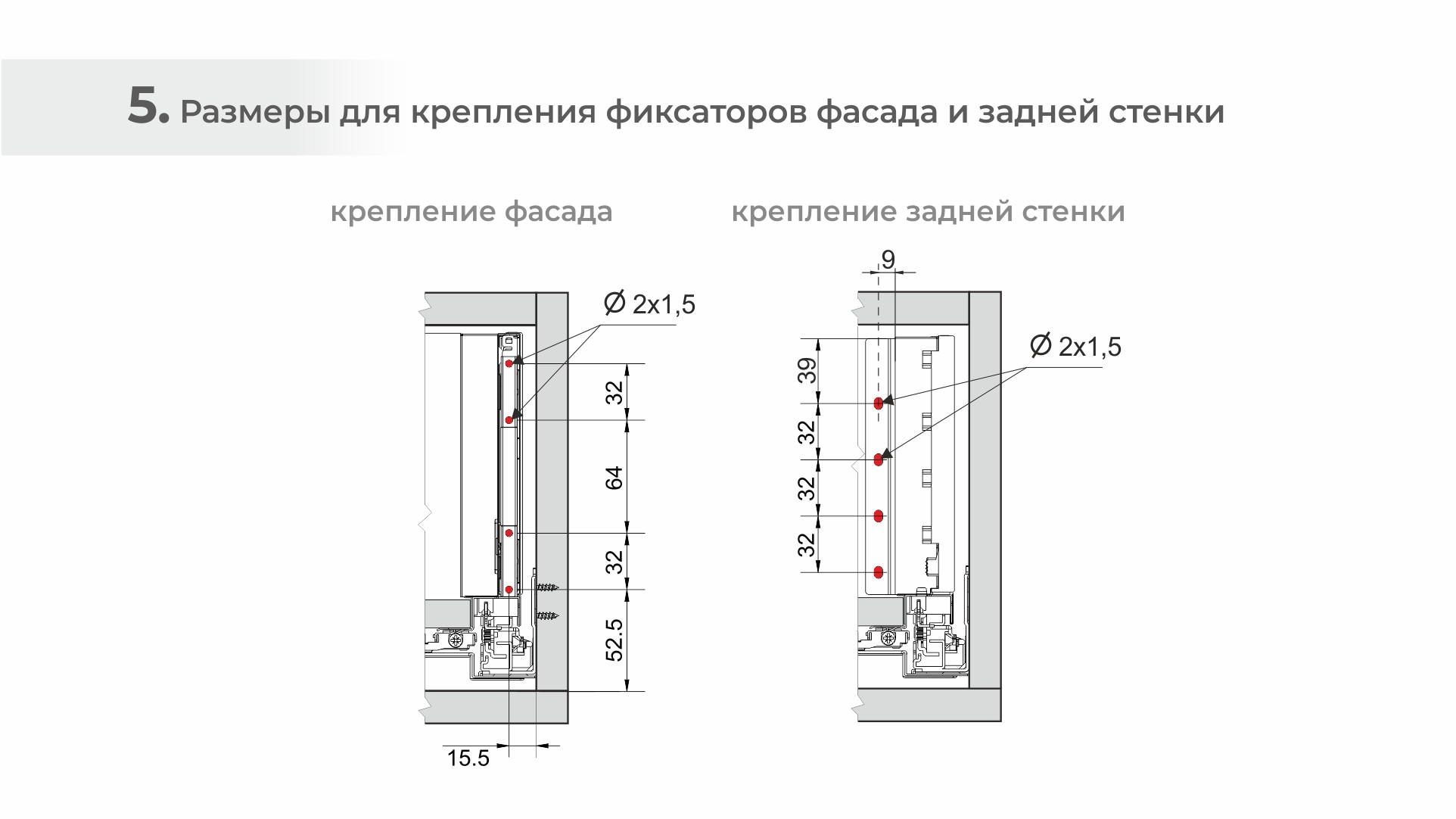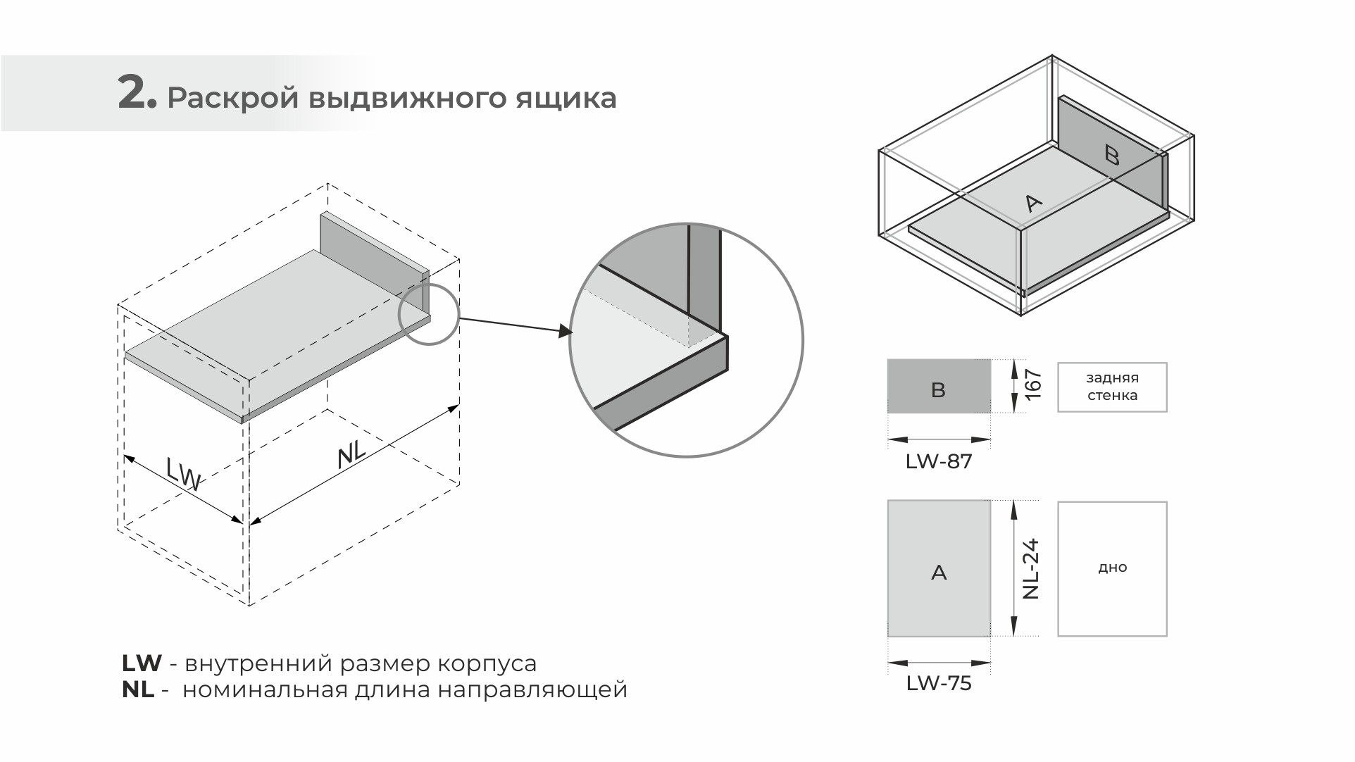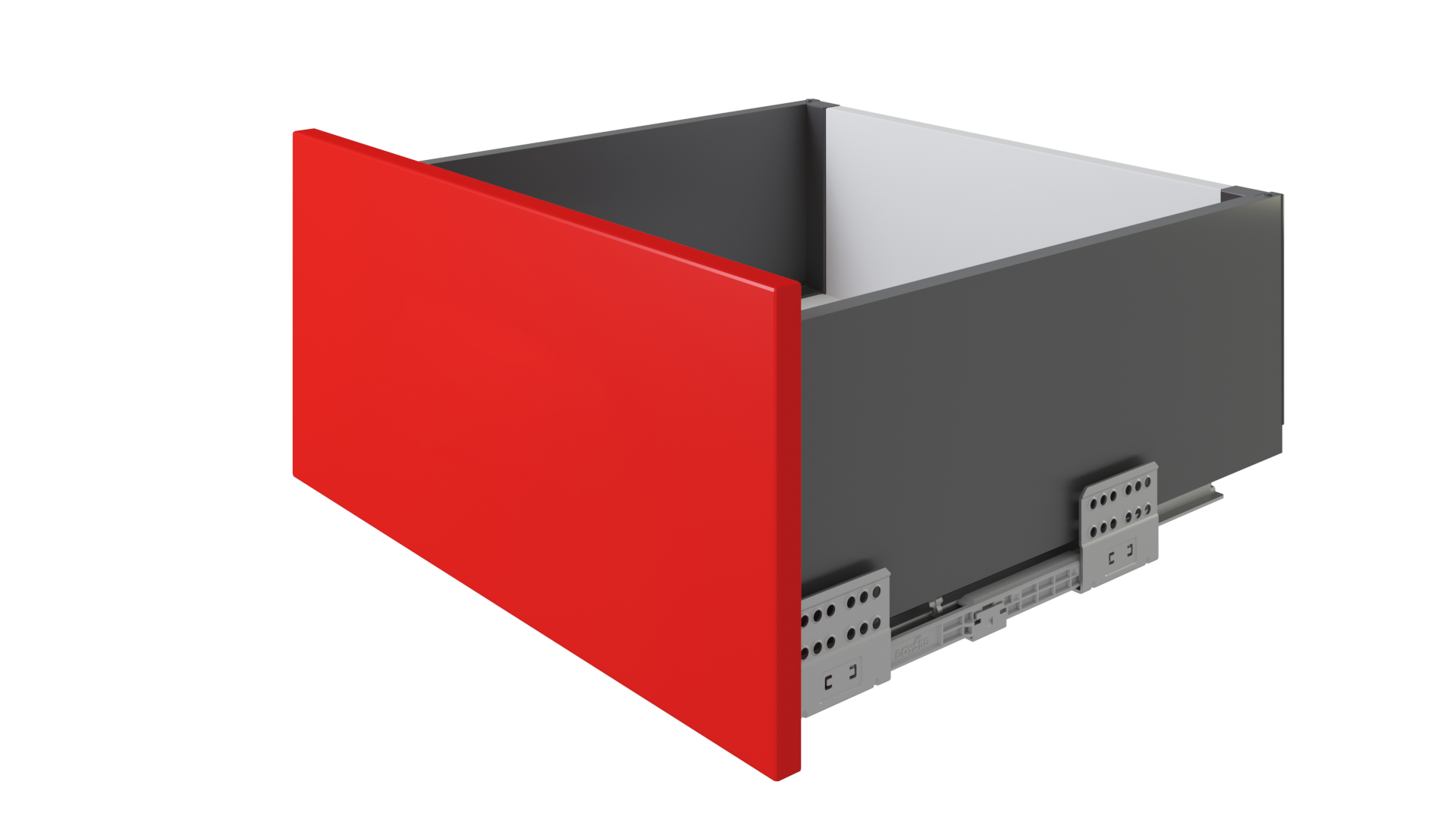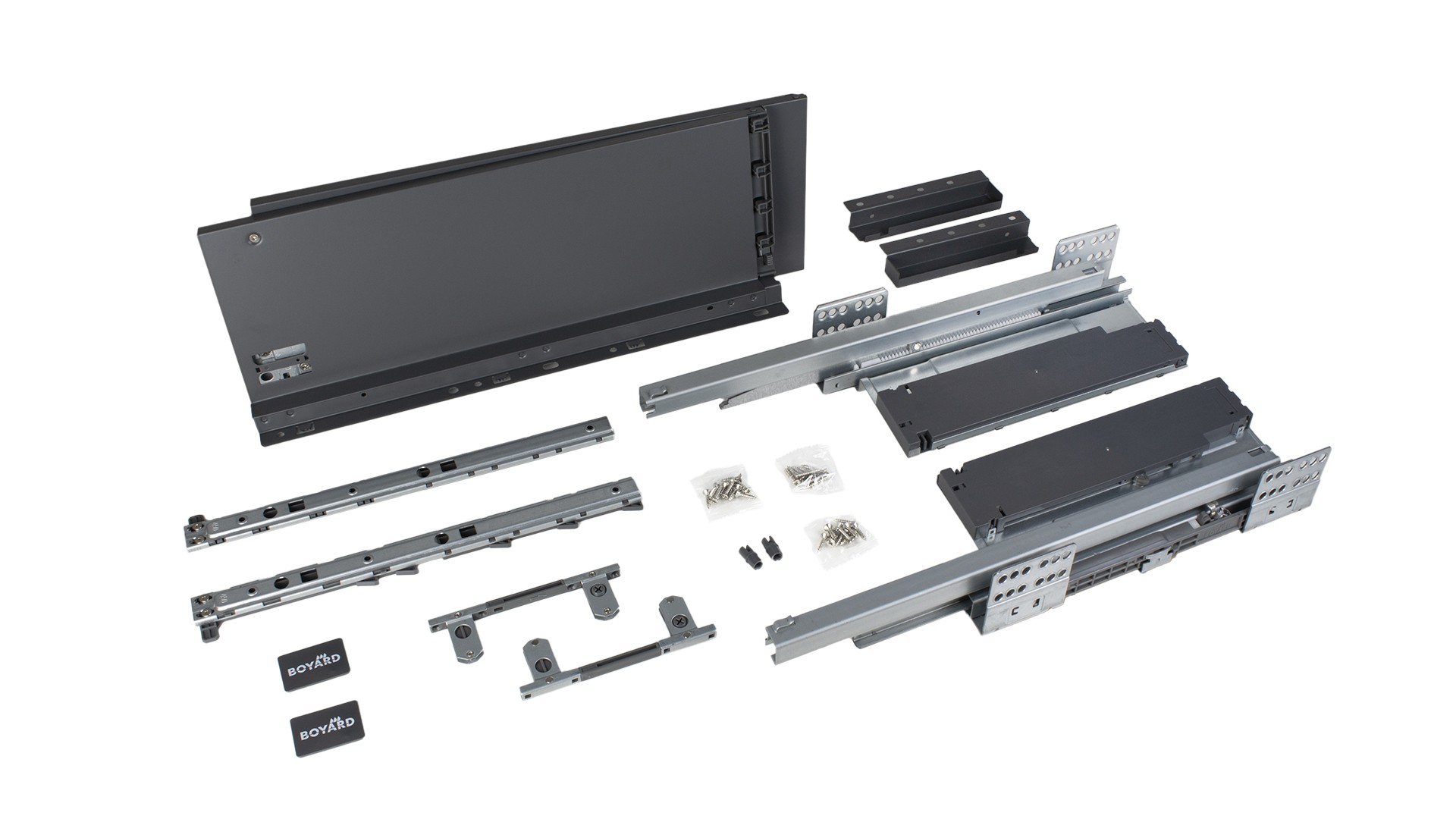 Для сборки выдвижного мебельного ящика на базе СТАРТ PUSH+SOFT SB40 необходимо самостоятельно изготовить фасад, заднюю стенку и дно мебельного ящика. Дополнительные рейлинги позволяют увеличить полезную высоту боковых стенок выдвижного ящика. Рейлинги и держатели к ним приобретаются отдельно.