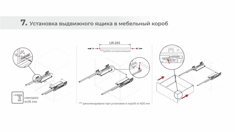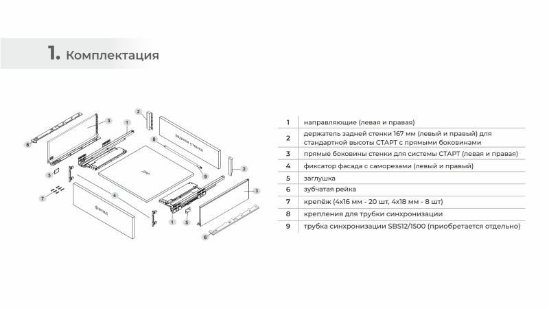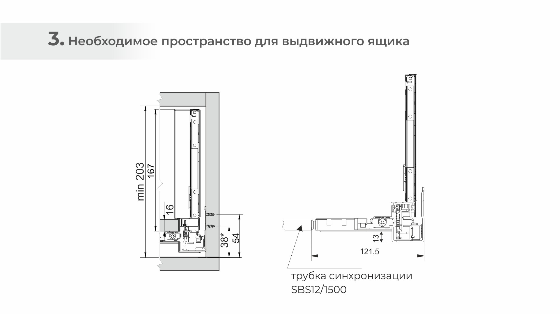 При создании габаритных мебельных ящиков шириной от 600 мм рекомендуется использовать поворотно-синхронизирующую трубку SBS12. Держатели для трубки представлены в комплекте СТАРТ PUSH+SOFT, а SBS12 приобретается отдельно.