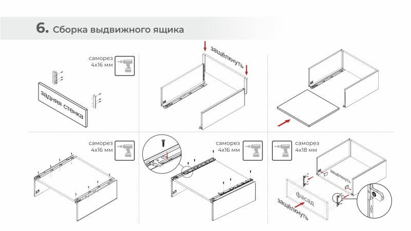 Сборка выдвижного ящика СТАРТ PUSH+SOFT проводится по аналогии со сборкой других типов СТАРТ, за исключением одного момента: при креплении боковины ко дну выдвижного ящика необходимо дополнительно прикрепить рейку ответной части механизма PUSH через пластину крепления боковой стенки. Для простоты процесса на рейке предусмотрены специальные выступы, которые входят в отверстия пластины боковой стенки.