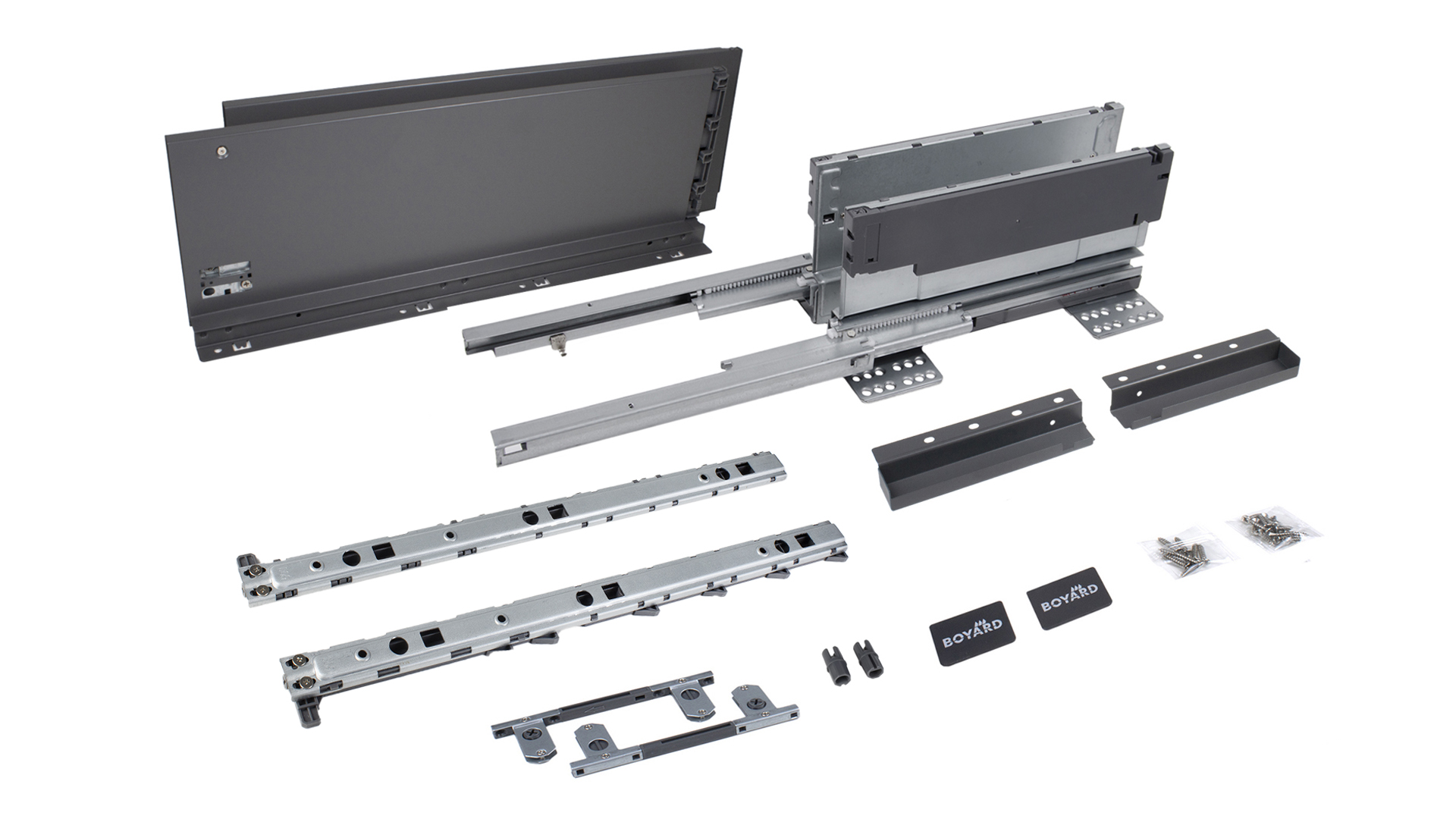 Для сборки выдвижного мебельного ящика на базе СТАРТ PUSH+SOFT SB40 необходимо самостоятельно изготовить фасад, заднюю стенку и дно мебельного ящика. Дополнительные рейлинги позволяют увеличить полезную высоту боковых стенок выдвижного ящика. Рейлинги и держатели к ним приобретаются отдельно.